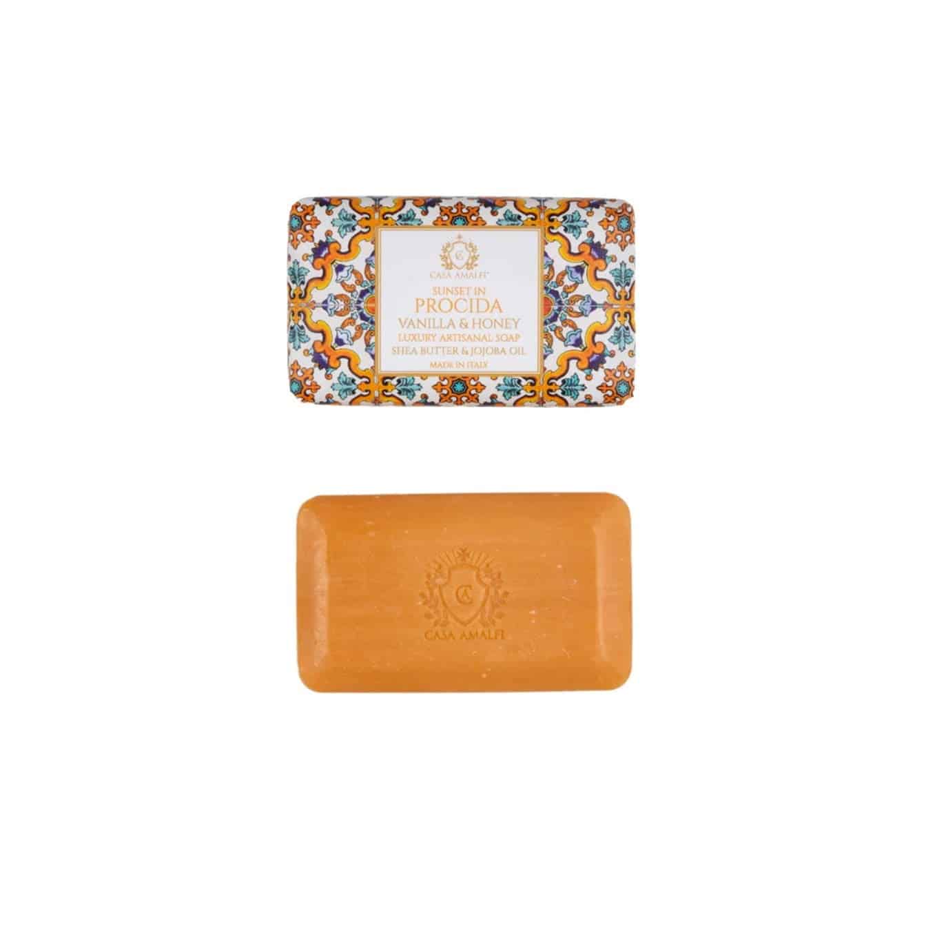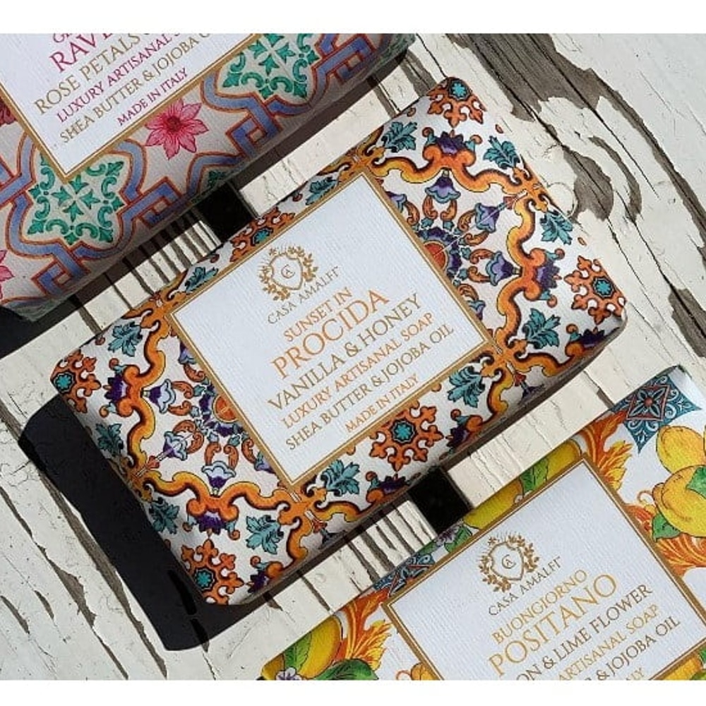 Sapunul artizanal Sunset in Procida, de la brandul italian Casa Amalfi, are un miros dulce de miere si vaniloe iar spuma matasoasa, bogata in uleiuri esentiale, lasa pielea fina si usor parfumata. Sapunul este realizat de artizani in Italia, totul intr-un ambalaj elegant, in stilul maiolica.