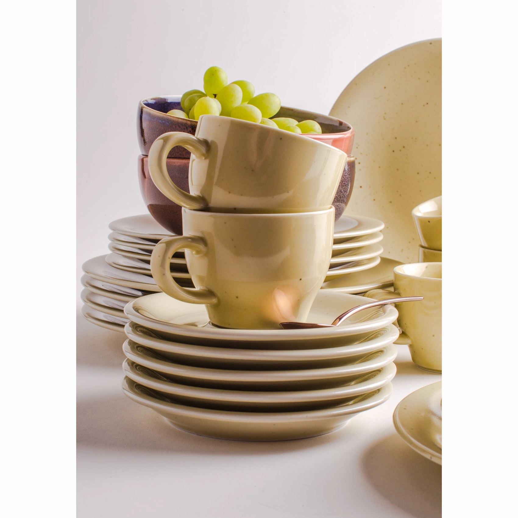 Setul pentru 6 persoane este format din: cesti pentru cafea (0.18 litri), farfurii mici (Ø16 cm), farfurii medii (Ø21.5 cm), farfurii pentru cina (Ø26.5 cm) si 6 boluri (Ø16 cm).