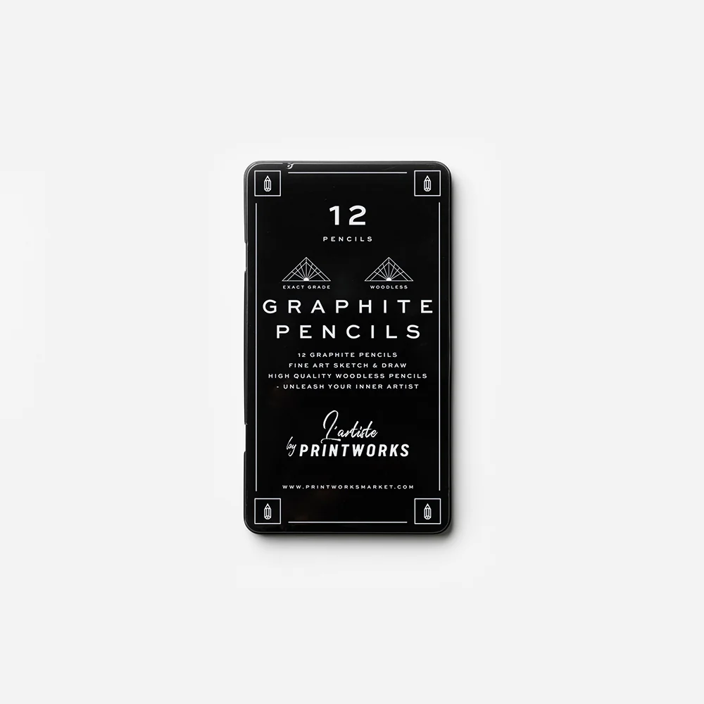 Setul de 12 creioane grafit de la Printworks este obiectul care nu trebuie sa lipseasca din casa unui artist, fie in devenire, fie experimentat sau chiar a unui amator de schite. Cunoscute si sub denumirea de `creioane fara lemn`, acest set este compus din piese cu 12 gradatii diferite: de la cel mai moale si pana la cel mai tare.
