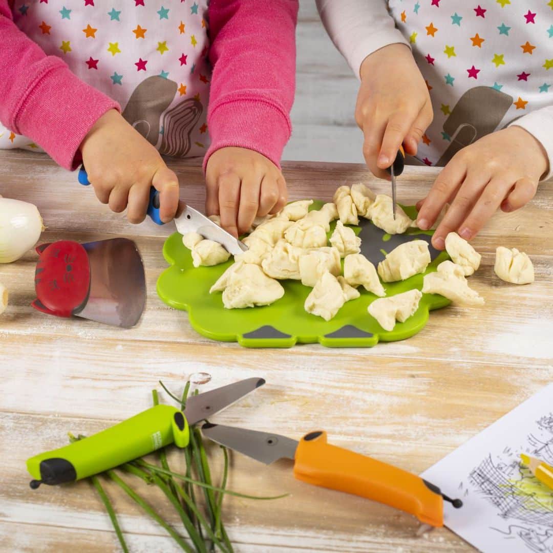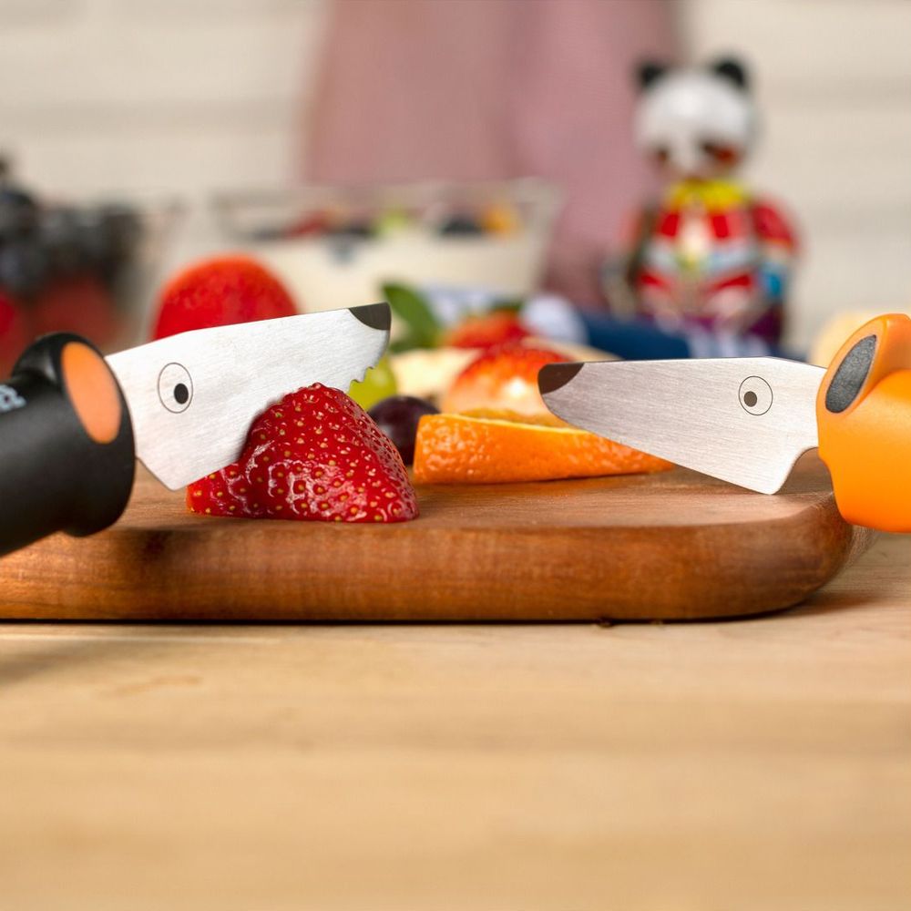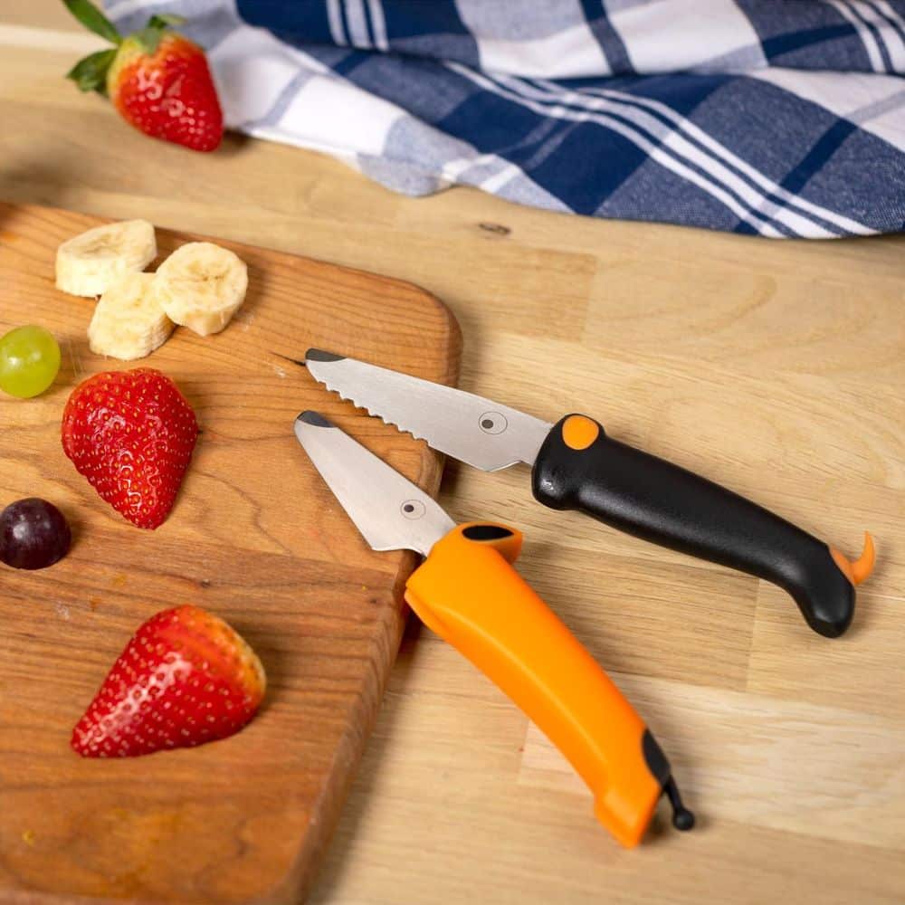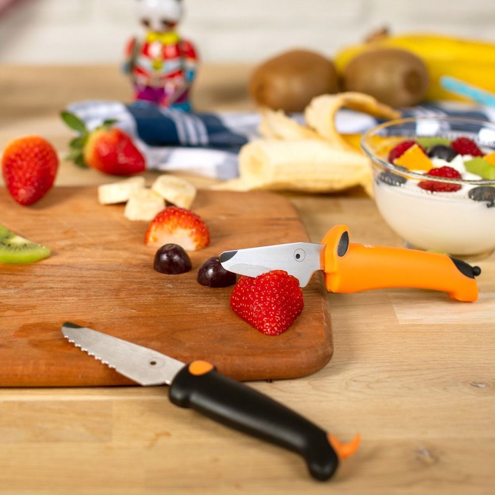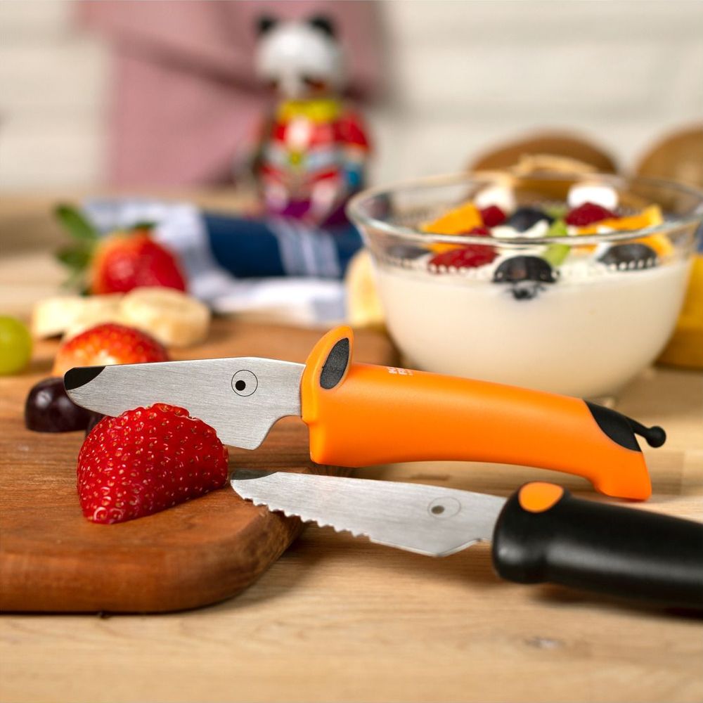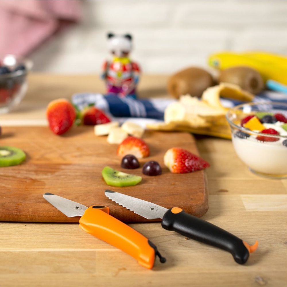 Kuhn Rikon vine in ajutorul micilor bucatari cu acest set de 2 cutite special concepute pentru siguranta copiilor. Setul include un cutit cu lama dreapta, ideal pentru intins unt sau gem, si un cutit cu lama zimtata, pentru fructe si legume.