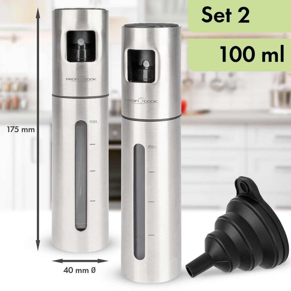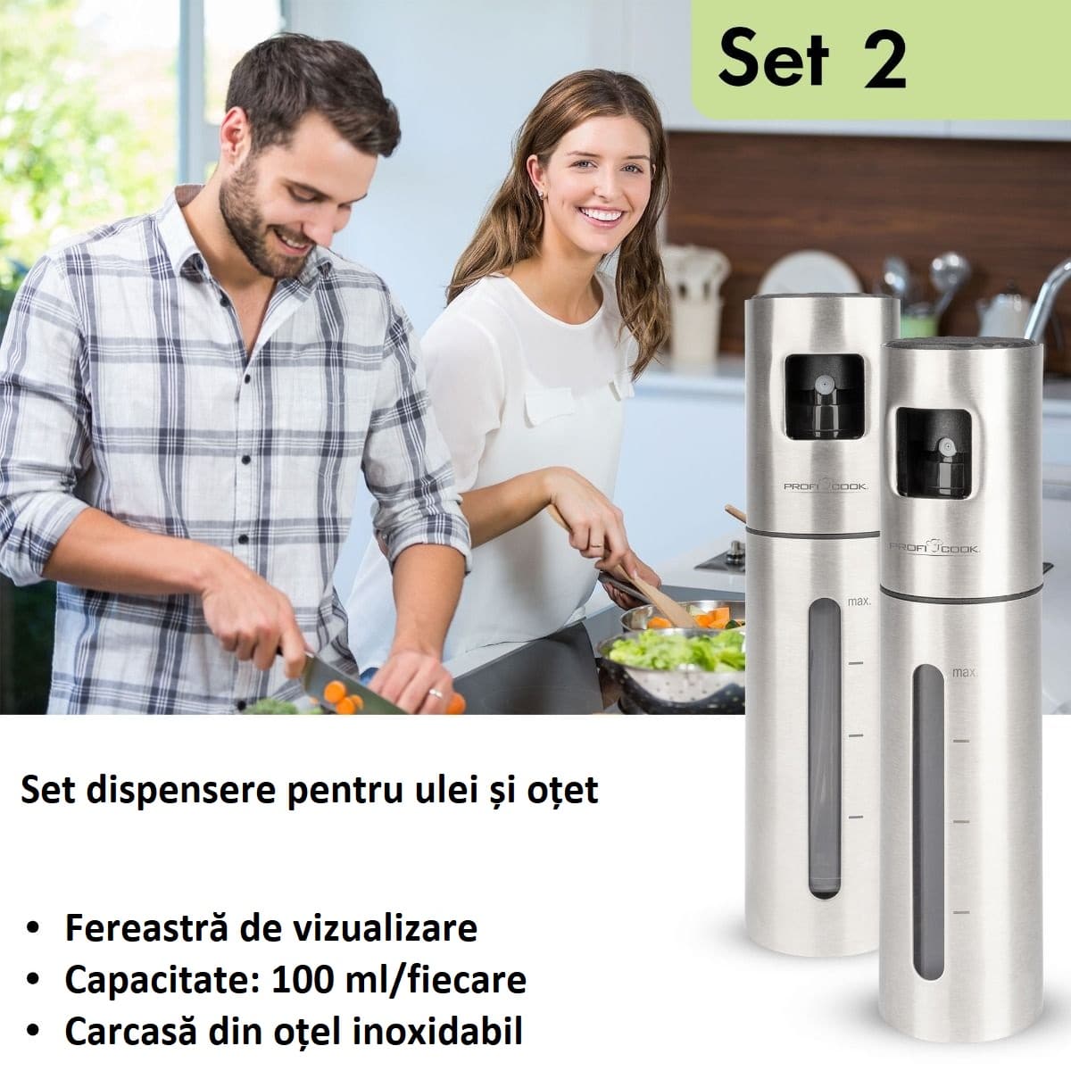 Aceasta fuziune dintre functionalitate si eleganta va va duce experienta culinara la un nou nivel. Setul contine doua recipiente pulverizatoare de inalta calitate, fiecare cu o capacitate de 100 ml. De la otet si ulei, pana la sos de soia si suc de citrice proaspat stors, acest dispenser ofera modalitati versatile de a adauga o nota finala preparatelor tale.