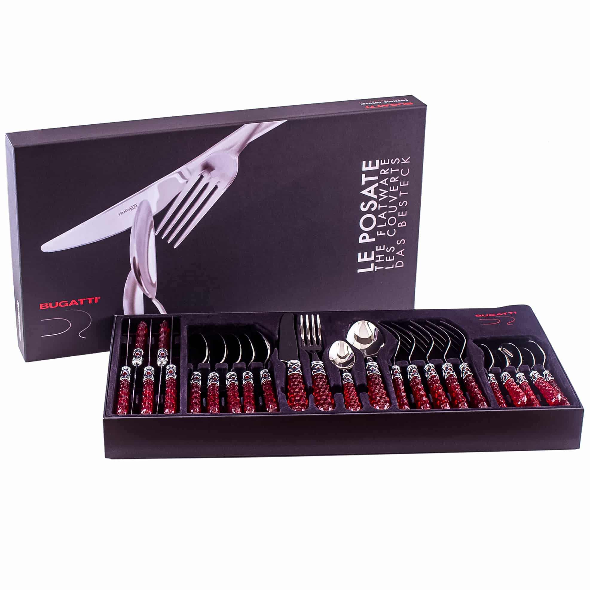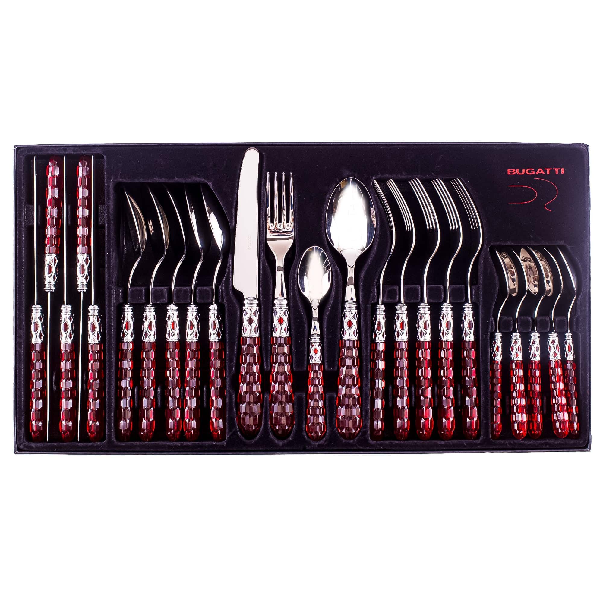 Aceasta colectie de tacamuri din 24 de piese de la Casa Bugatti este fabricata din otel inoxidabil de inalta calitate, cu un fler inconfundabil, Art Deco, fiind decorat cu accente colorate din ABS, pentru a da o nota vesela bucatariei dumneavoastre. Fabricat din materiale Premium de inalta calitate, setul Bohemia vine acompaniat de o cutie de prezentare de lux.