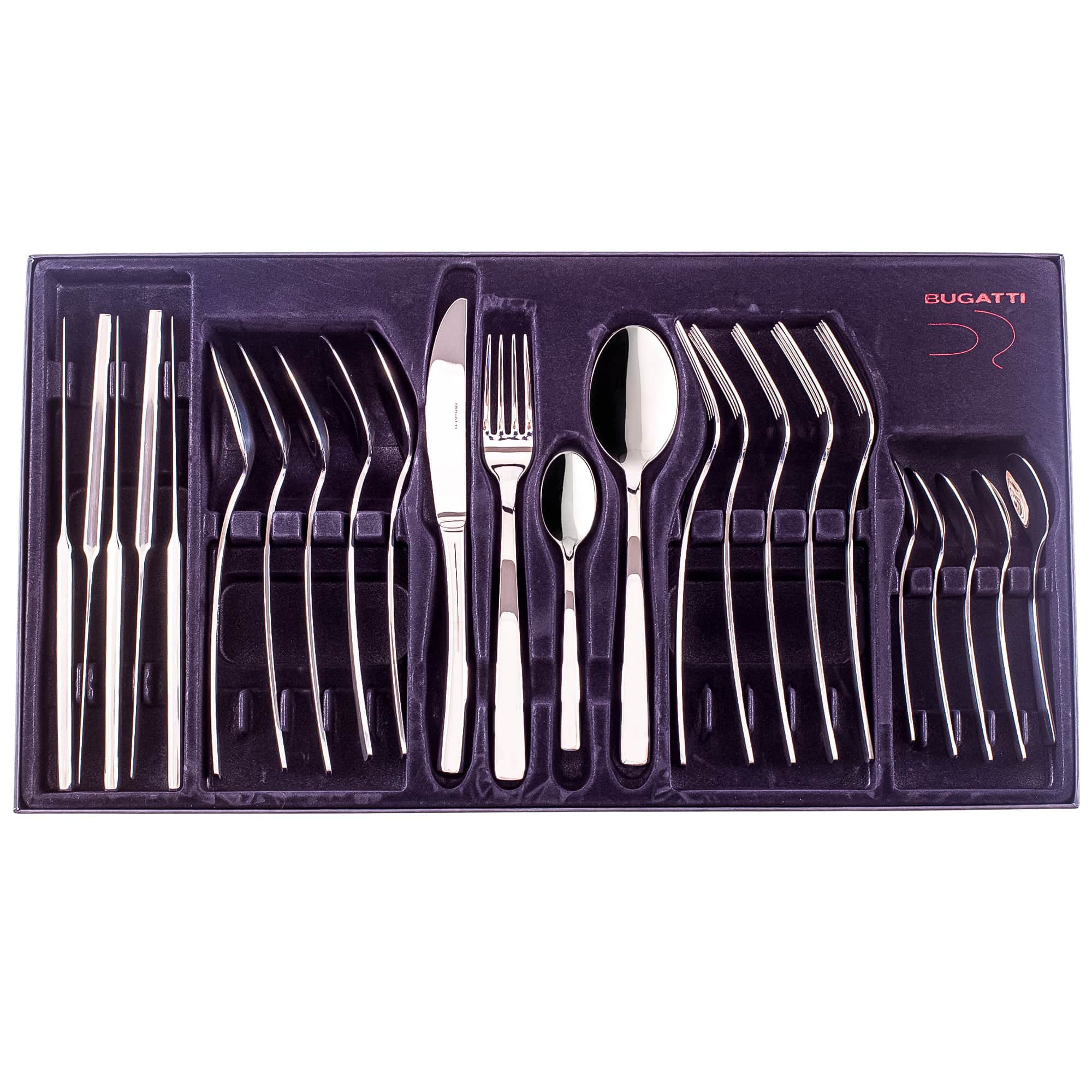 Aceasta colectie de tacamuri din 24 de piese de la Casa Bugatti este fabricata din otel inoxidabil de inalta calitate, cu un fler inconfundabil, Art Deco. Fabricat din materiale Premium de inalta calitate, setul Tendence vine acompaniat de o cutie de prezentare de lux.