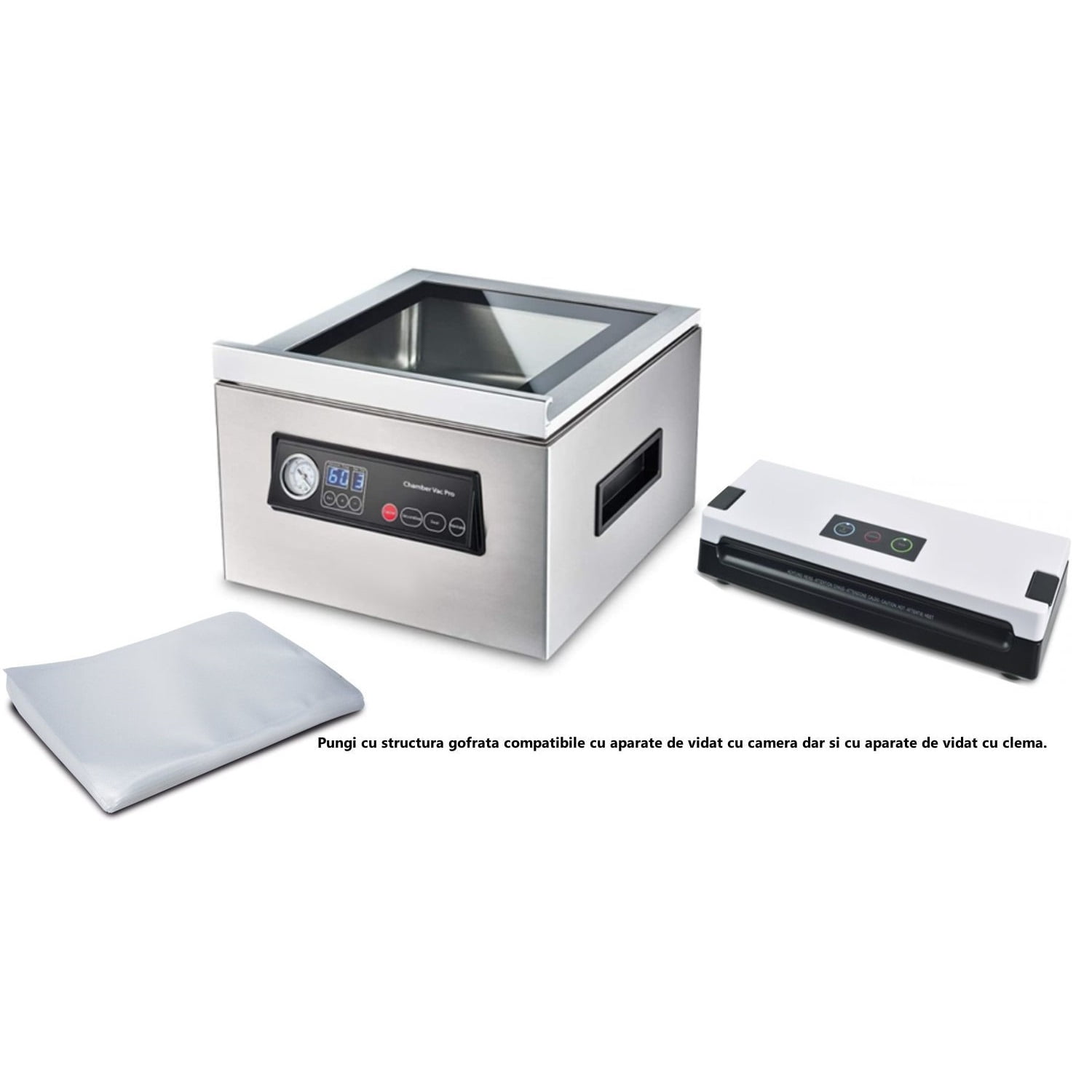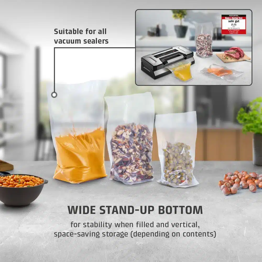 Pungile asigura o extractie imbunatatita a aerului si sunt potrivite pentru alimentele umede, uscate dar si pentru lichide. Acestea nu contin BPA, fiind sigure pentru alimente si, de asemenea, sunt rezistente la cuptorul cu microunde. Totodata, aceste pungi sunt ideale pentru gatitul Sous Vide.