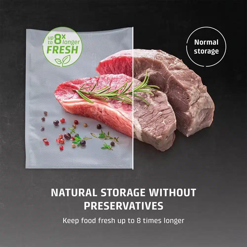 Setul de pungi pentru vidat de la Caso Germany, de calitate premium, vine in ajutorul dumneavoastra pentru a va pastra alimente proaspete pana cand doriti sa le consumati. Cu ajutorul procesului de vidare, creste durabilitatea alimentelor si se pastreaza aromele in timpul depozitarii, in congelator sau frigider. Puteti obtine un termen de valabilitate de 8 ori mai lung, fara pierderea aromei si a consistentei.
