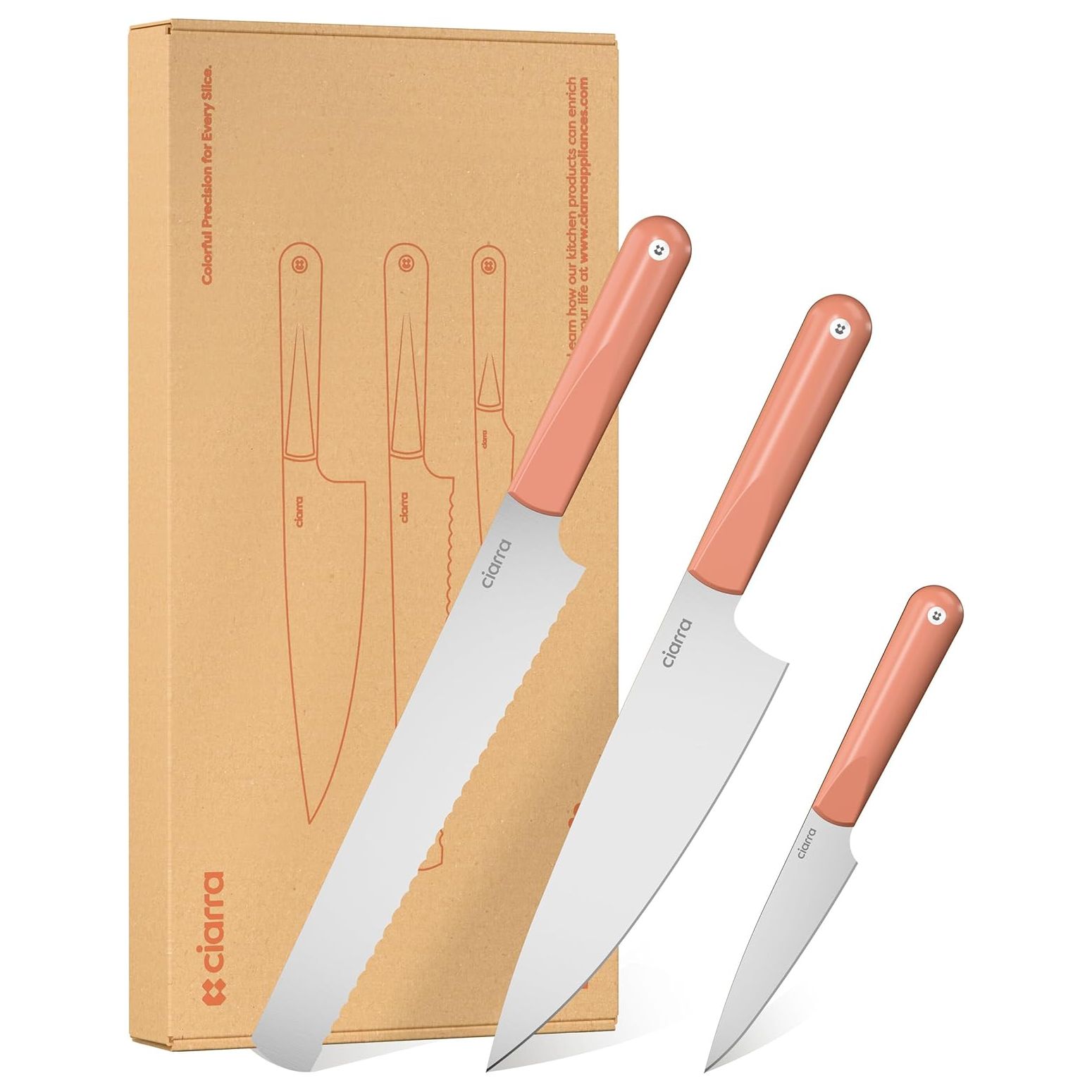 Ciarra Beyond Knife Trio este fabricat din otel inoxidabil 5CR15MOV de inalta calitate, cu continut ridicat de carbon, asigurand durabilitate. Lamele ultra-ascutite asigura taieturi precise. Manerele ergonomice ofera o prindere confortabila si sigura, reducand oboseala mainii in timpul utilizarii. Ideal pentru orice sarcina din bucatarie, acest set combina durabilitatea si confortul intr-unul.