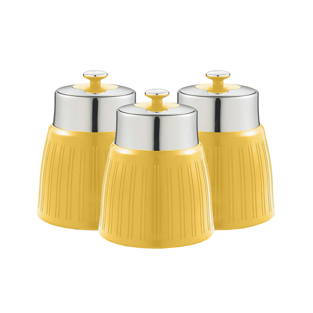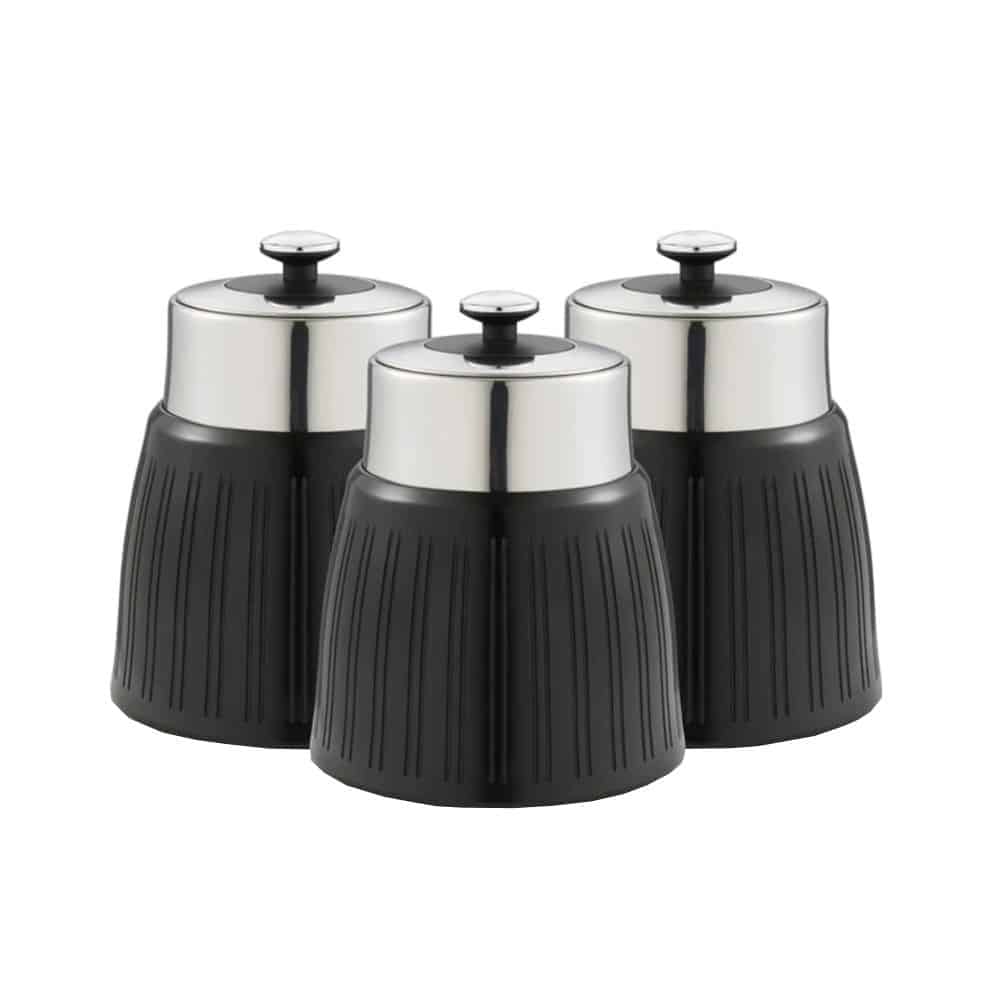 Pastreaza-ti mereu ceaiul, cafeaua si zaharul proaspete cu setul de trei recipiente de la Swan. Designul practic si elegant, cu dungi si capac cromat, adauga un stil retro cool in bucataria ta. Realizate din plastic durabil, cu interior din otel inoxidabil si inchidere ermetica aceste recipiente asigura prospetime maxima. Capacitatea de 1,2 litri te ajuta sa stochezi cantitati generoase de produse.
