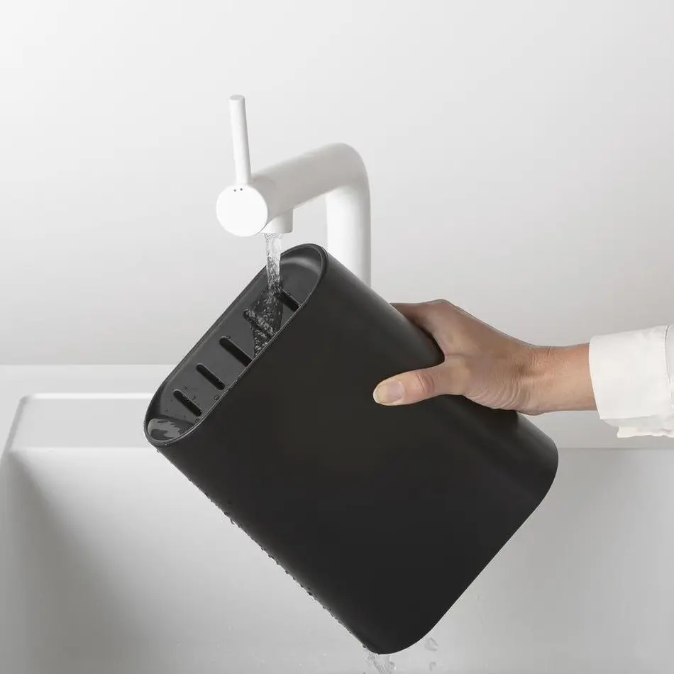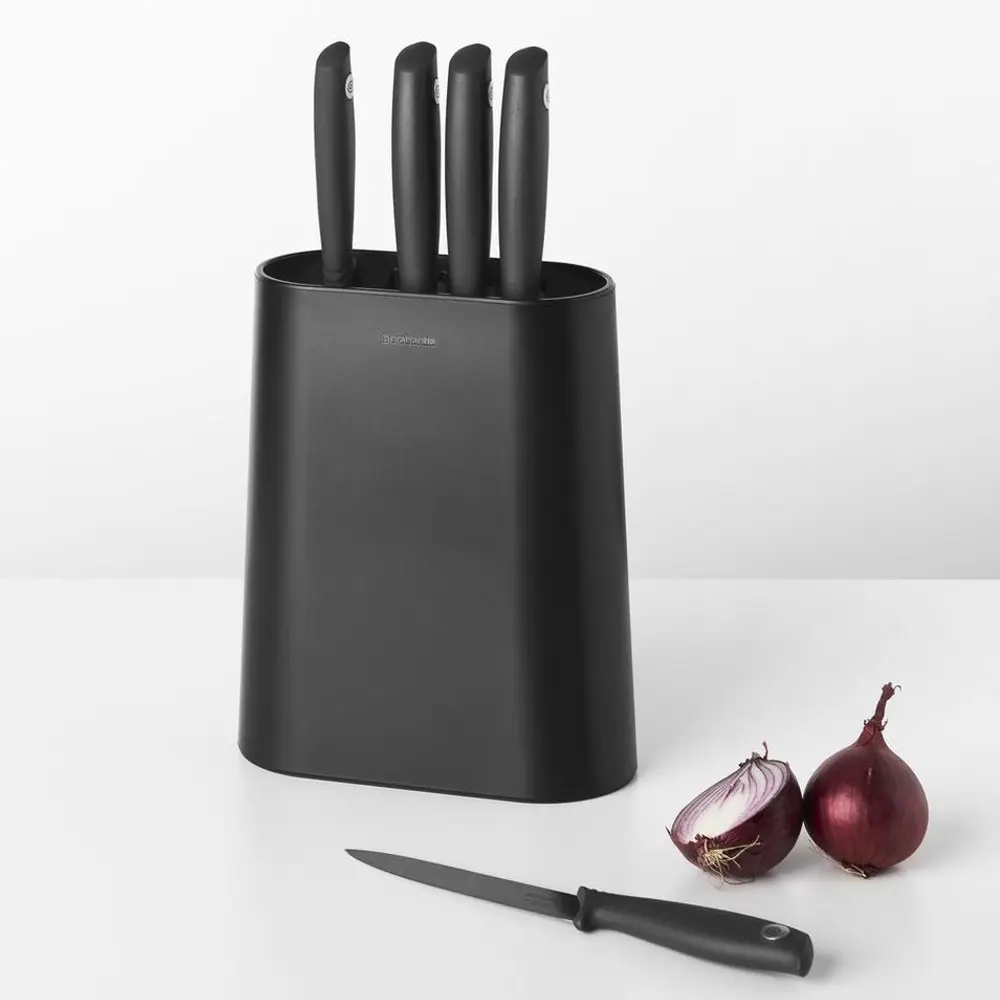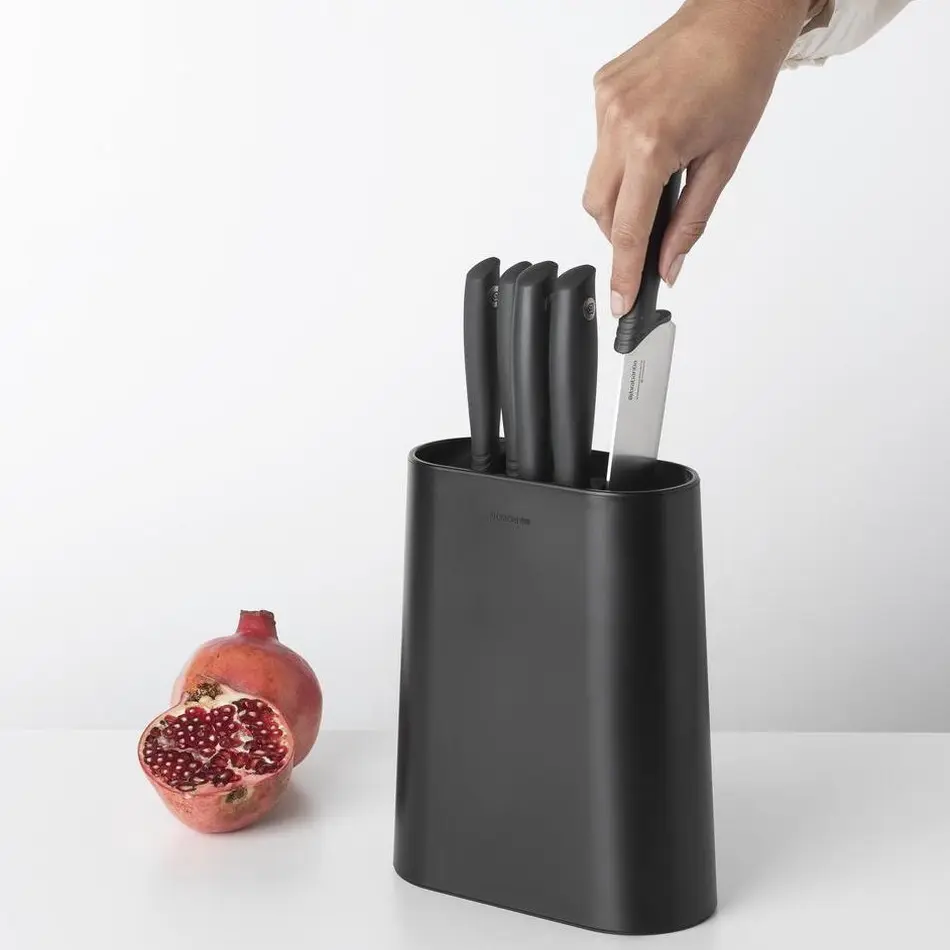 Setul de cutite vine acompaniat de un suport minimalist pentru ca ustensilele sa fie depozitate in siguranta, fara a se atinge intre ele, si pentru a ocupa cat mai putin loc.
