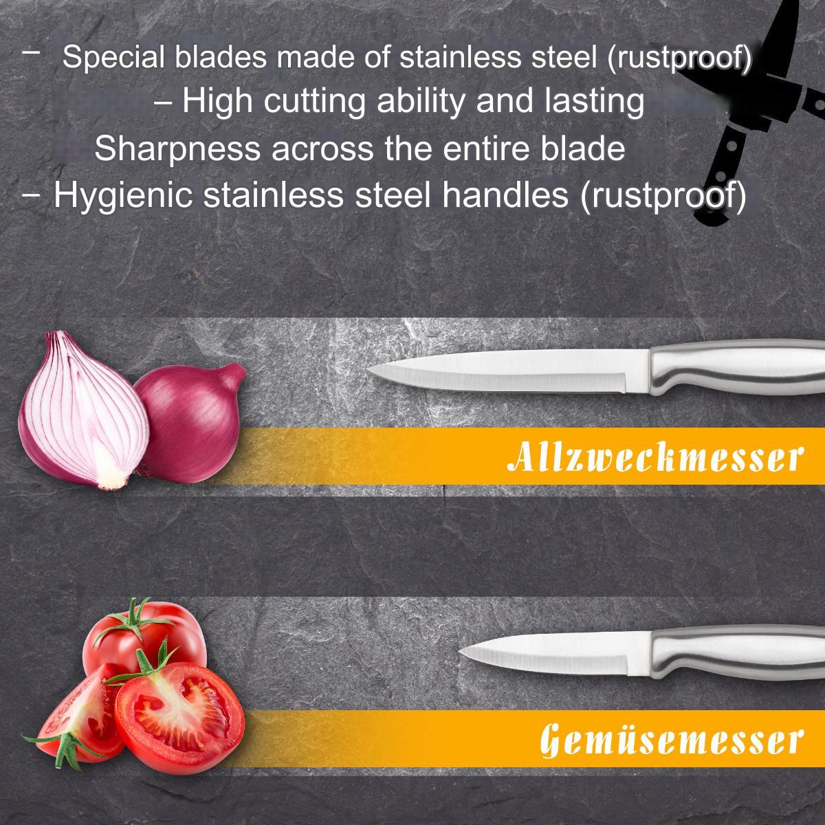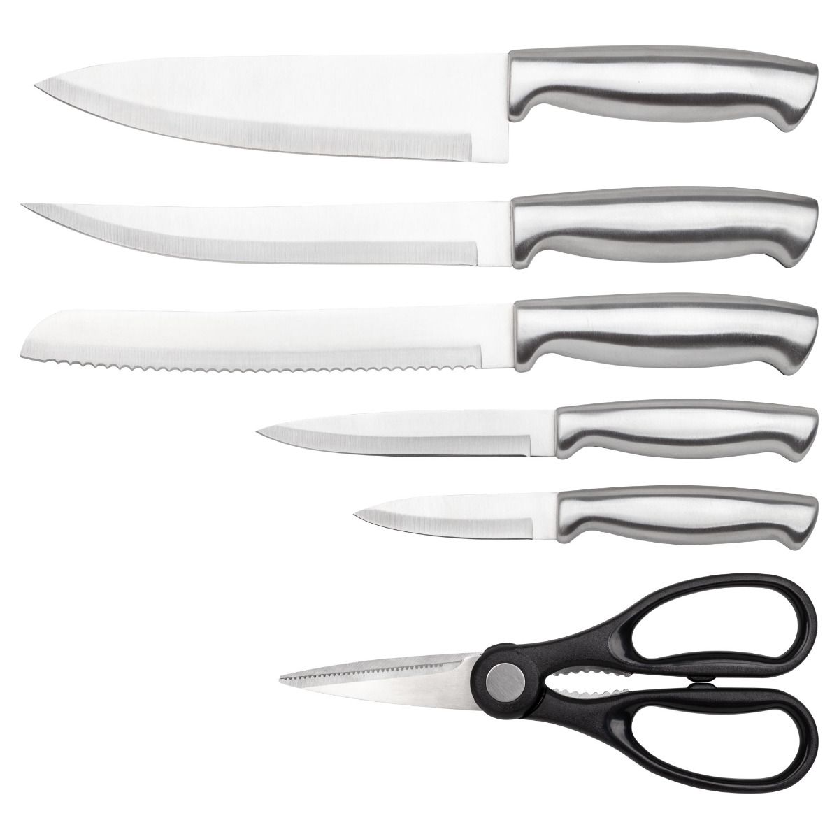 Setul de cutite, de la brandul german Classbach, este tot ceea ce aveti nevoie in bucataria dumneavoastra! Setul, fabricat din materiale premium, include: cutitul bucatarului, cutit de filetat, cutit de paine, cutit universal, cutit de curatat si foarfeca universala.