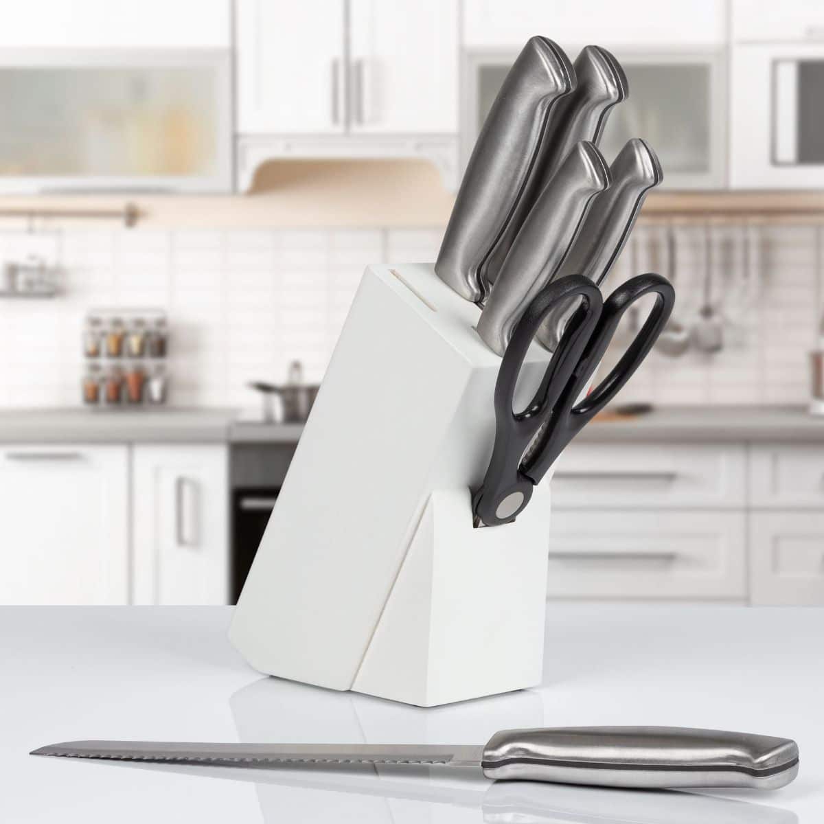Setul de cutite vine acompaniat de un suport din lemn vopsit pentru ca ustensilele sa fie depozitate in siguranta, fara a se atinge intre ele, si pentru a ocupa cat mai putin loc.