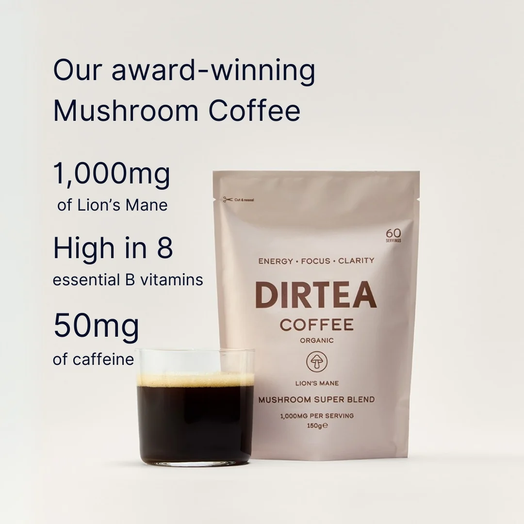 DIRTEA Coffee – O bautura organica ce contine cafea 100% Arabica, vitamine (B5, B6, acid folic si B12) si extract de Lion’s Mane, o ciuperca bine cunoscuta pentru proprietatile sale antioxidante, ce imbunatateste functiile cognitive si memoria.