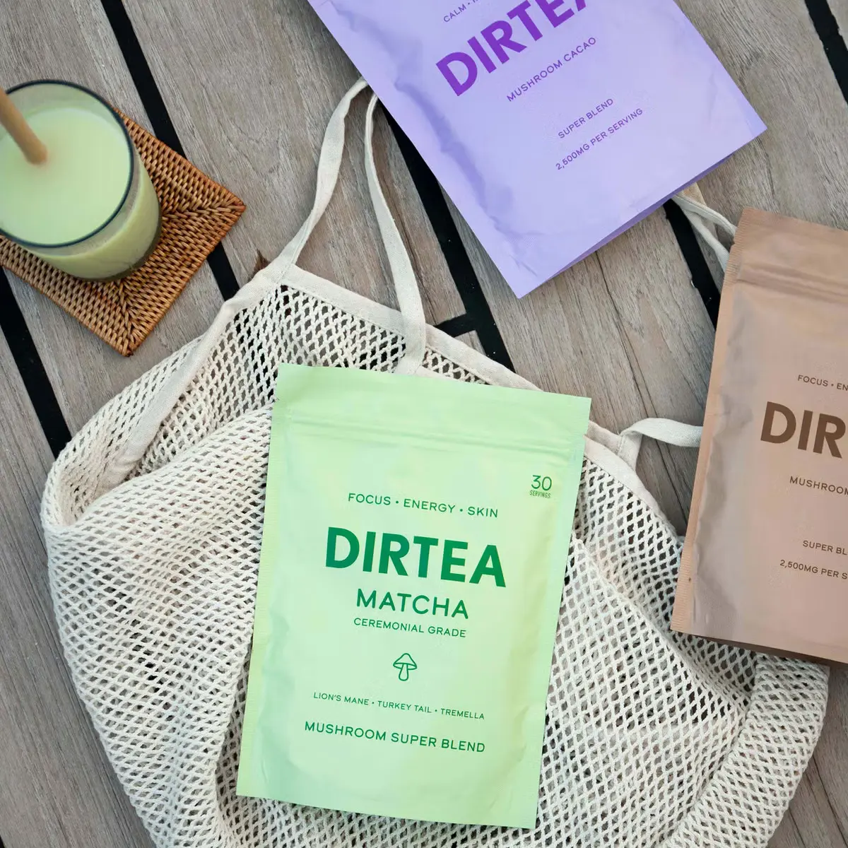 DIRTEA Matcha – Cel mai cremos si delicios matcha ceremonial, in combinatie cu multivitamine (biotina, B5, B6 si B12) si extract de ciuperci adaptogene creeaza o fuziune armonioasa ce ofera energie si favorizeaza sanatatea parului, pielii si unghilor.