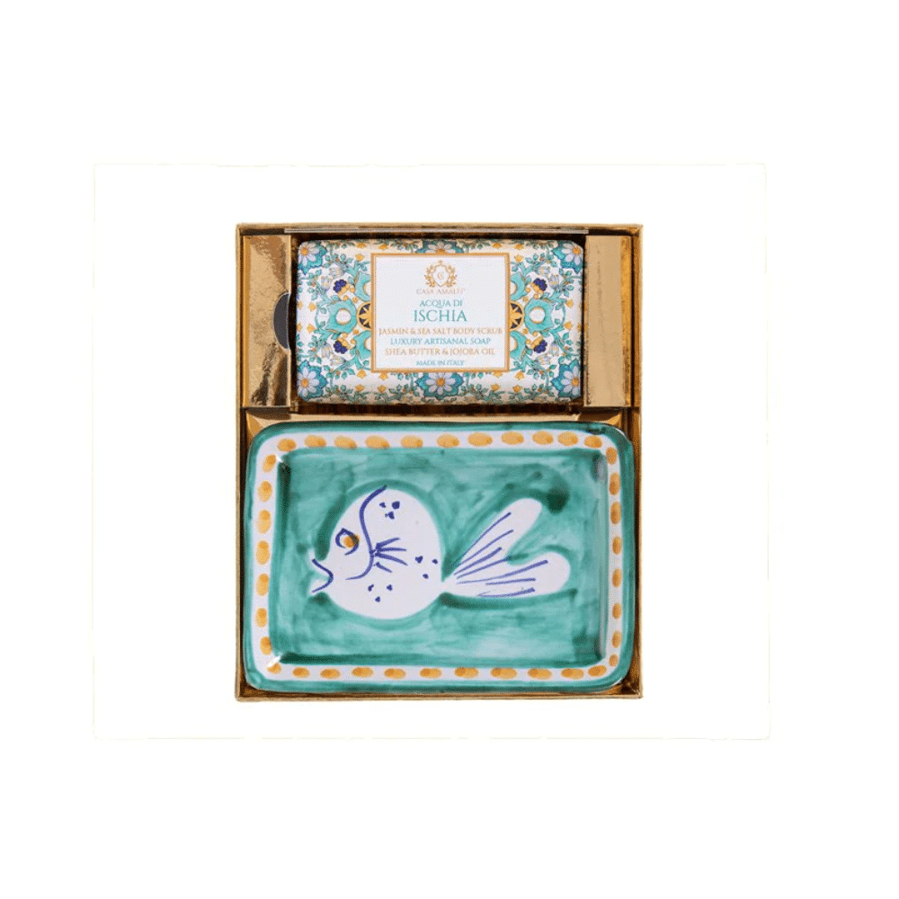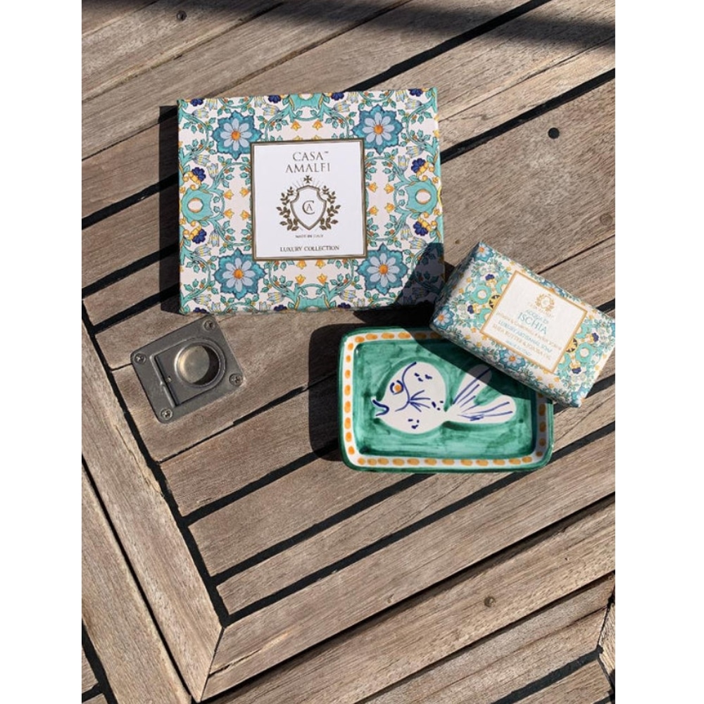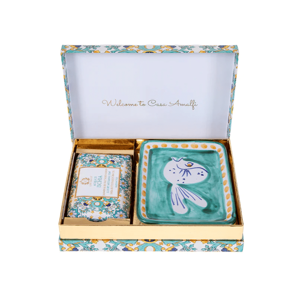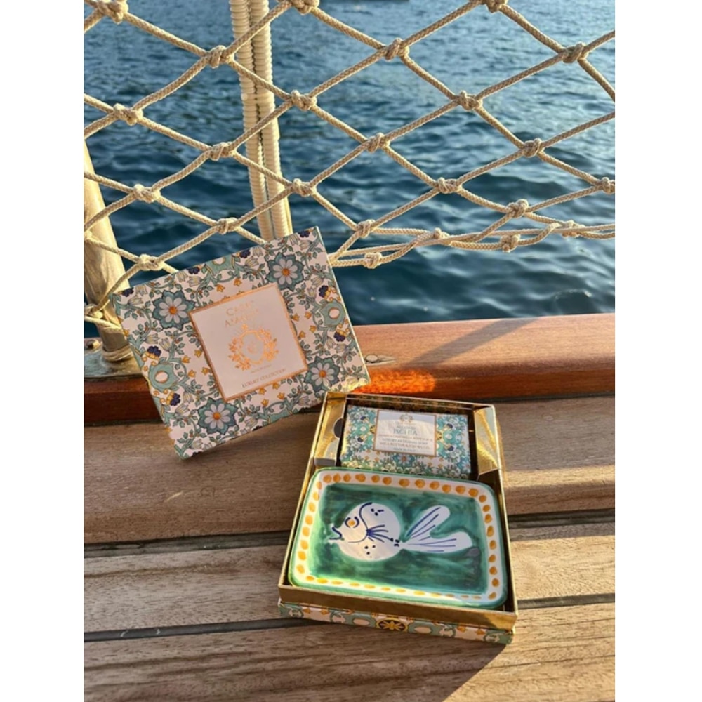 Setul cadou Acqua di Ischia, de la brandul italian Casa Amalfi, contine un sapun de corp si o superba sapuniera din ceramica pictata manual, realizata de artizani in Vietri Sul Mare (Italia), totul ambalat intr-o cutie eleganta, in stil maiolica.