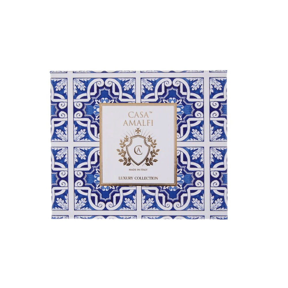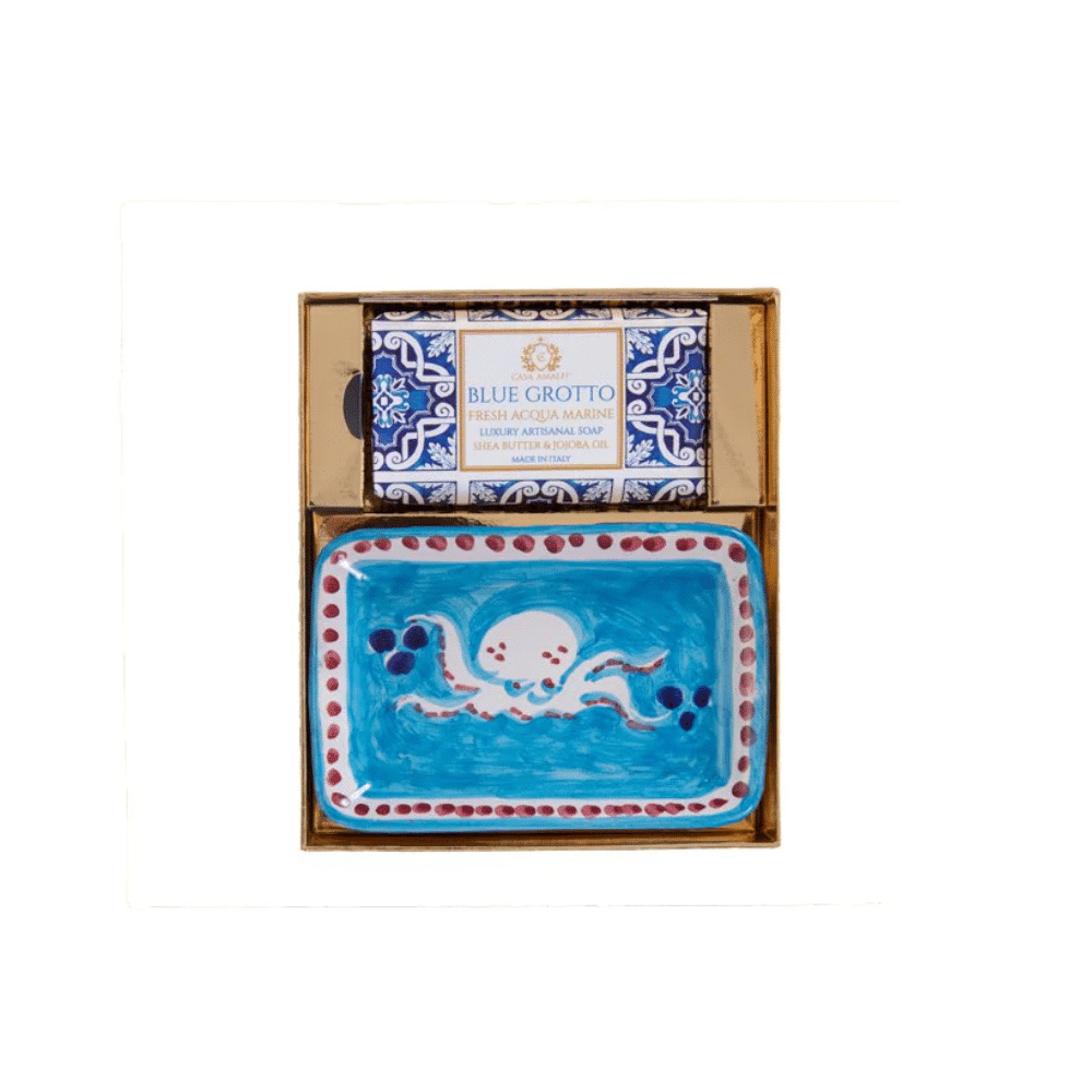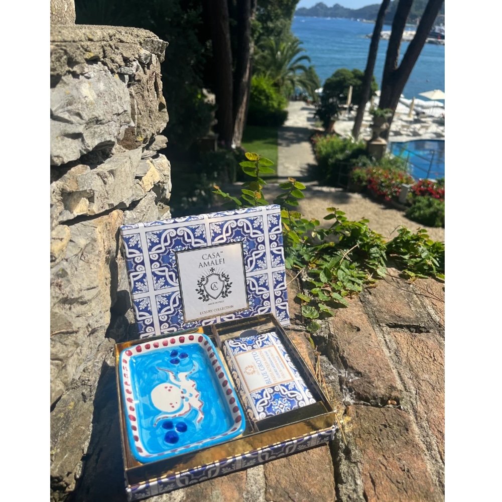 Setul cadou Blue Grotto, de la brandul italian Casa Amalfi, contine un sapun de corp si o superba sapuniera din ceramica pictata manual, realizata de artizani in Vietri Sul Mare (Italia), totul ambalat intr-o cutie eleganta, in stil maiolica.
