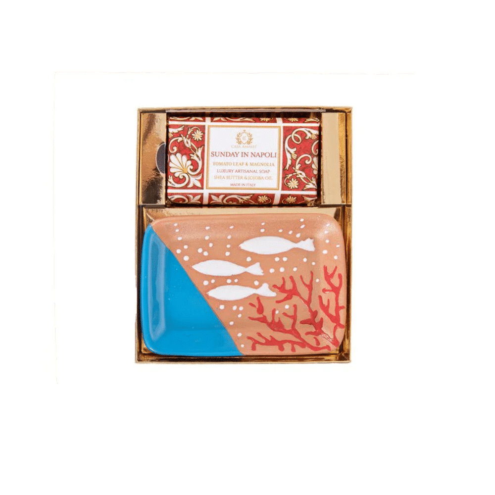 Setul cadou Sunday in Napoli, de la brandul italian Casa Amalfi, contine un sapun de corp si o superba sapuniera din ceramica pictata manual, realizata de artizani in Vietri Sul Mare (Italia), totul ambalat intr-o cutie eleganta, in stil maiolica.