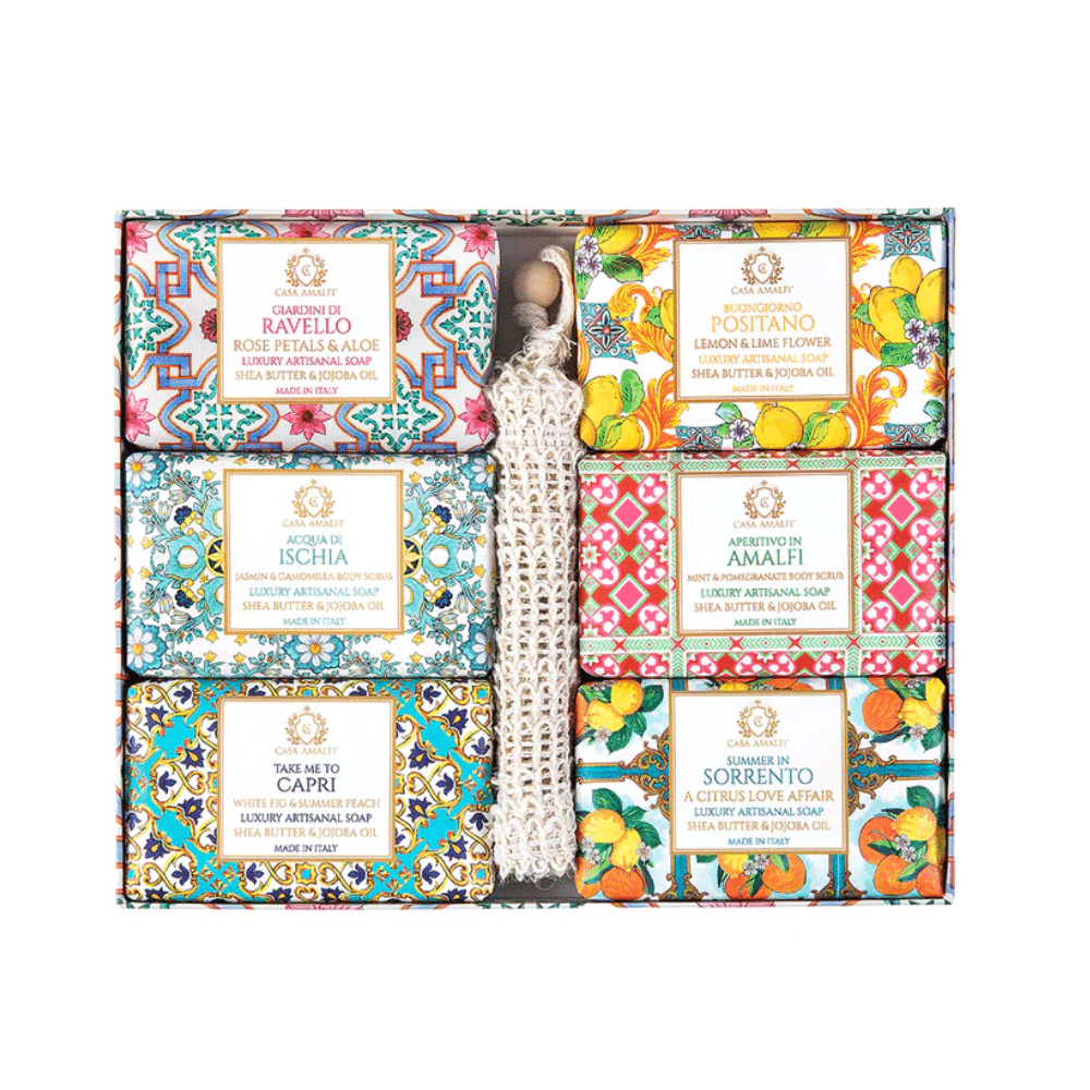 Setul contine: sapun Giardini di Ravello (trandafir si aloe), sapun Buongiorno Positano (lamaie si flori de lime), sapun exfoliant Acqua di Ischia (iasomie si musetel), sapun exfoliant Aperitivo in Amalfi (menta si rodie), sapun Take me to Capri (smochina alba si piersici), Summer in Sorrento (citrice si mirodenii) si saculet exfoliat.