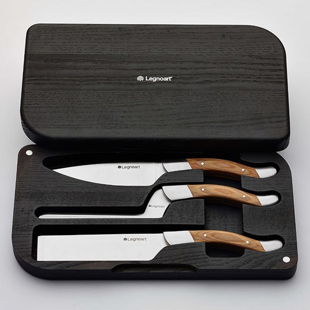 Setul de cutite pentru branzeturi Fromager de la Legnoart are un design si calitate Premium, iar cele 3 cutite sunt fabricate din otel japonez de inalta calitate. De asemenea, acest set vine intr-o cutie de lux din lemn masiv.