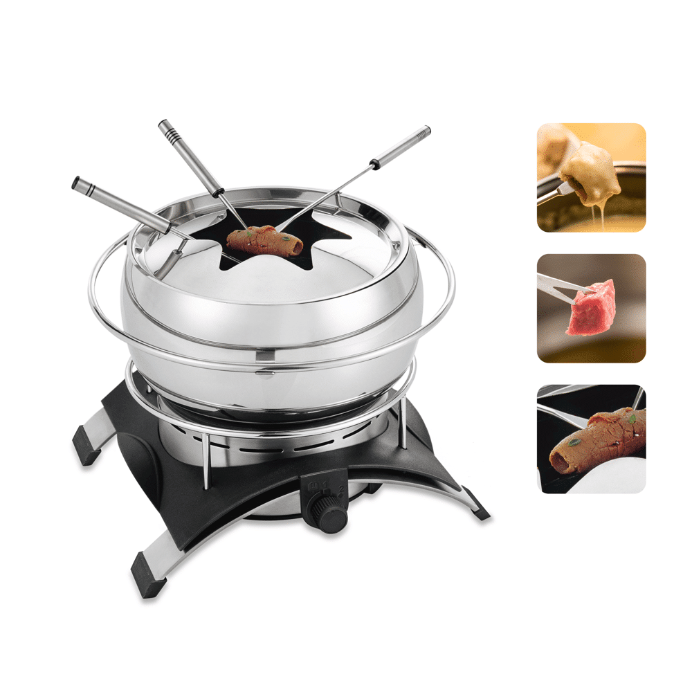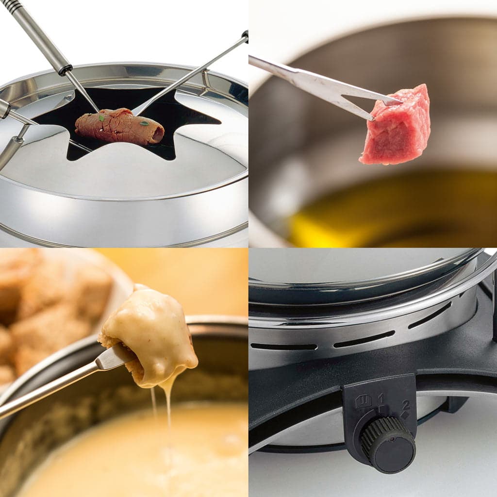 Gatitul cu setul fondue INOX de la Novis este un deliciu culinar, cu multe optiuni de preparare. Cu acest aparat puteti obtine o mare varietate de fondue din branzeturi fine sau ciocolata apetisanta, dar si o multime de alte delicatese, ce pot fi preparate cu gust si usor in oala de otel inoxidabil de inalta calitate. Acest lucru se datoreaza, de asemenea, protectiei practice impotriva stropirii si acoperirii anti-aderente.