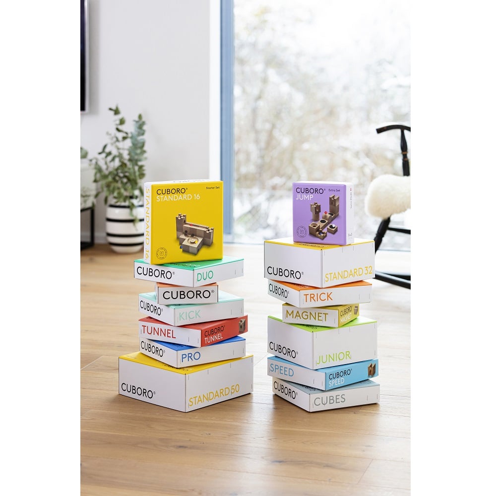 TRICK Extra Set este ideal pentru completarea fascinantelor jocuri educative CUBORO. Foloseste cuburi si circuite pentru a construi structuri originale si piste interesante pentru bilele tale din marmura. Acest joc de tip Montessori stimuleaza abilitatile motorii si cognitive ale copiilor, imbunatatind totodata atentia celor mici.