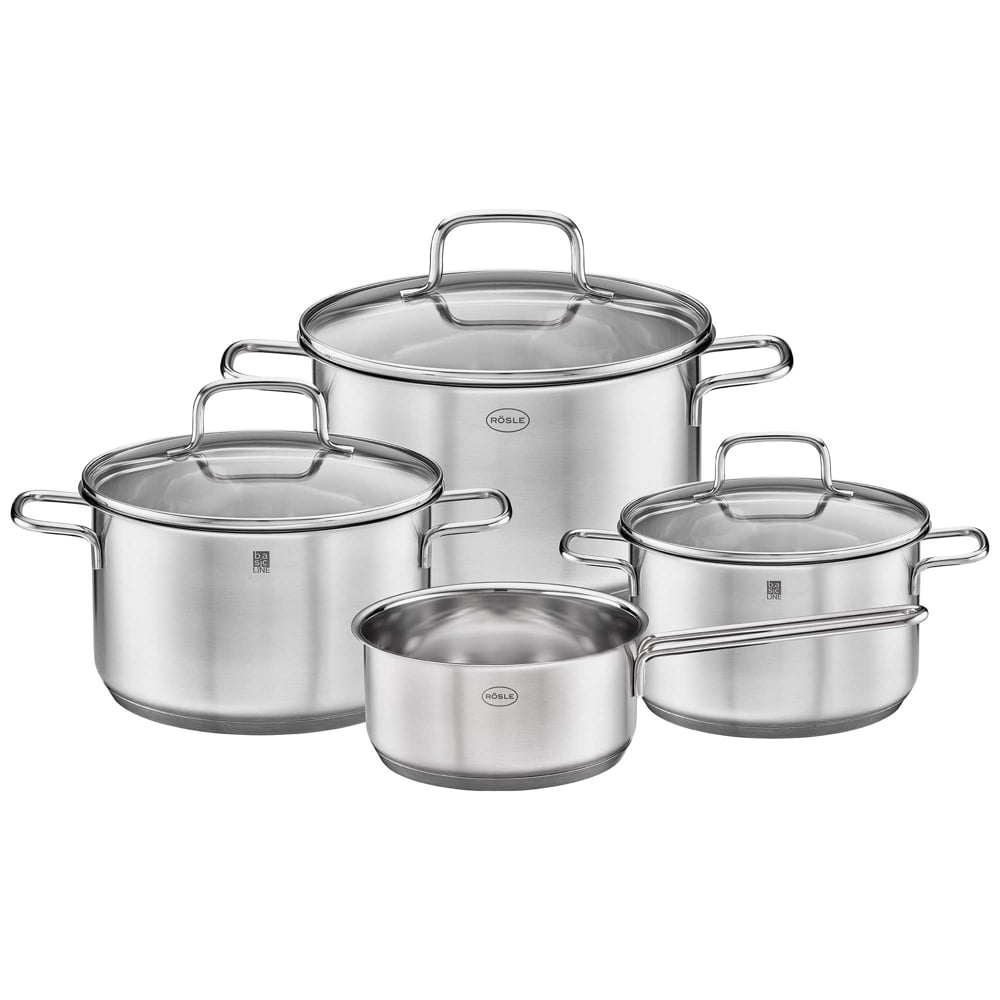 Gatiti orice fel de mancare pentru o persoana sau intreaga familie cu setul Basic de la Rösle care include 4 oale de dimensiuni diferite. Aceste oale din gama Basic de la Rösle, sunt fabricate din otel inoxidabil cu 3 straturi diferite, cu un strat intermediar de aluminiu, care ajuta la distribuirea caldurii uniform, astfel nu numai fundul cratitei este bine incalzit ci si partile laterale.