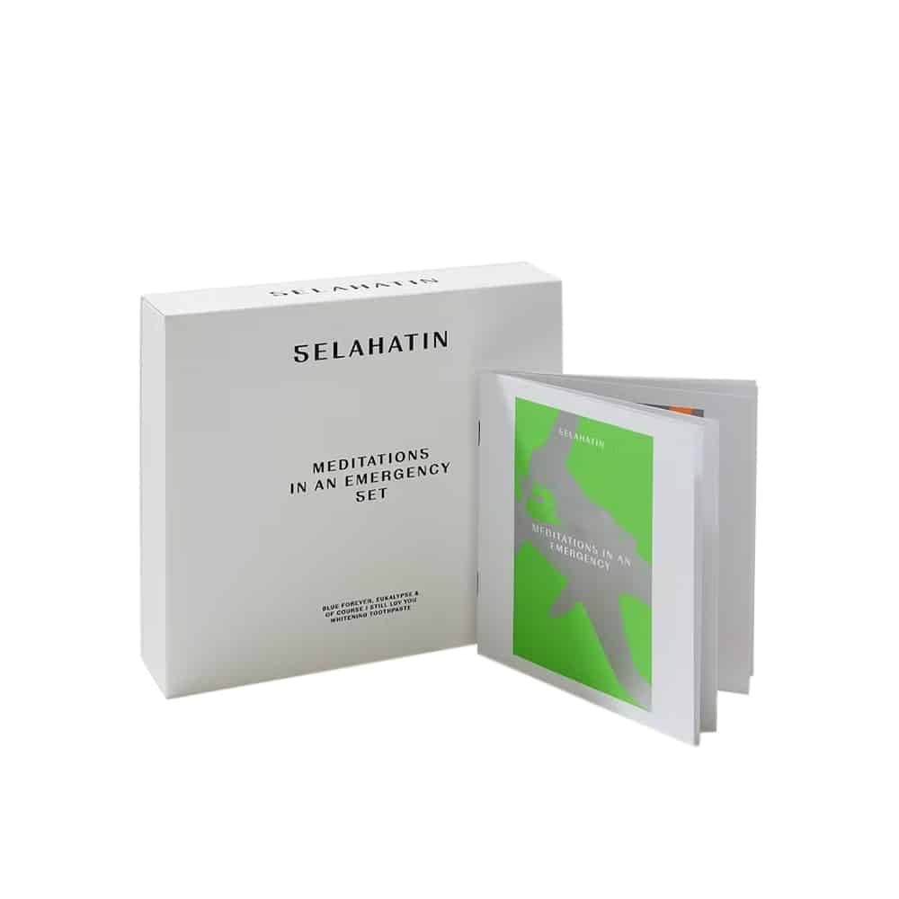 Meditations In An Emergency este o colectie de trei arome populare de pasta de dinti de albire, marca Selahatin. Setul contine Blue Forever, Eukalypse si Of Course I Still Luv You.