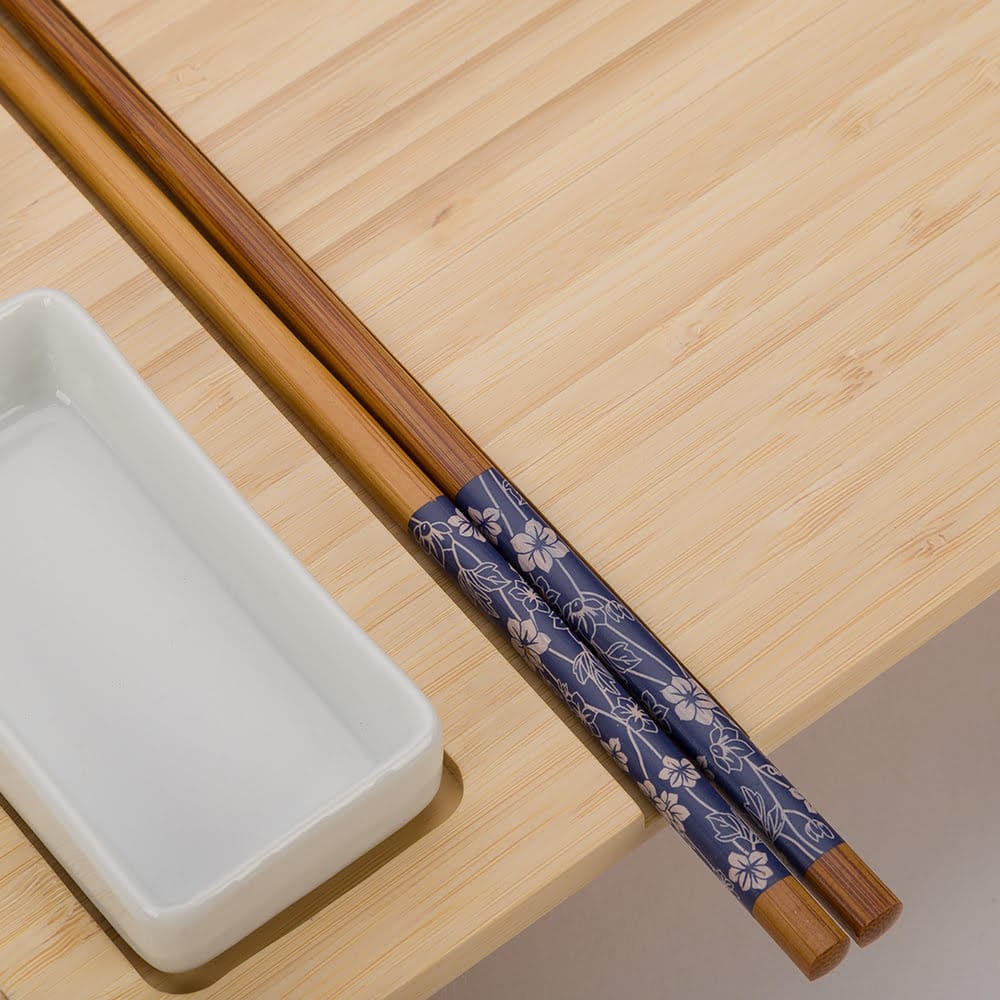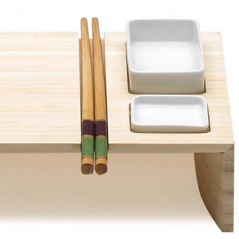 Modern si minimalist, aceast set nu numai ca are un aspect placut, ci si un design de calitate, fiind fabricat din lemn de frasin de cea mai inalta clasa si ceramica. Setul contine 2 boluri ceramice pentru wasabi si sos de soia, betisoare din bambus, tava servire.