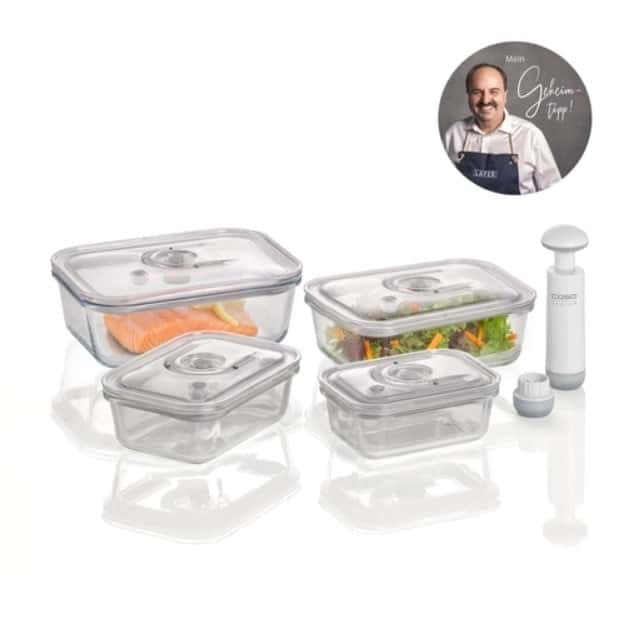 VacuBoxx E-Set de la Caso Germany este special conceput pentru ca dumneavoastra sa puteti vida diverse alimente, marina carnea sau pentru a pastra mancarea ramasa pentru mai mult timp. Recipientele pentru vidat din sticla cresc durabilitatea alimentelor si protejeaza pierderea aromelor in timpul depozitarii in congelator sau frigider.