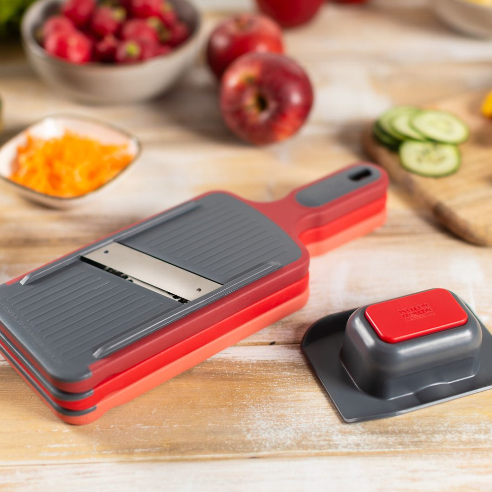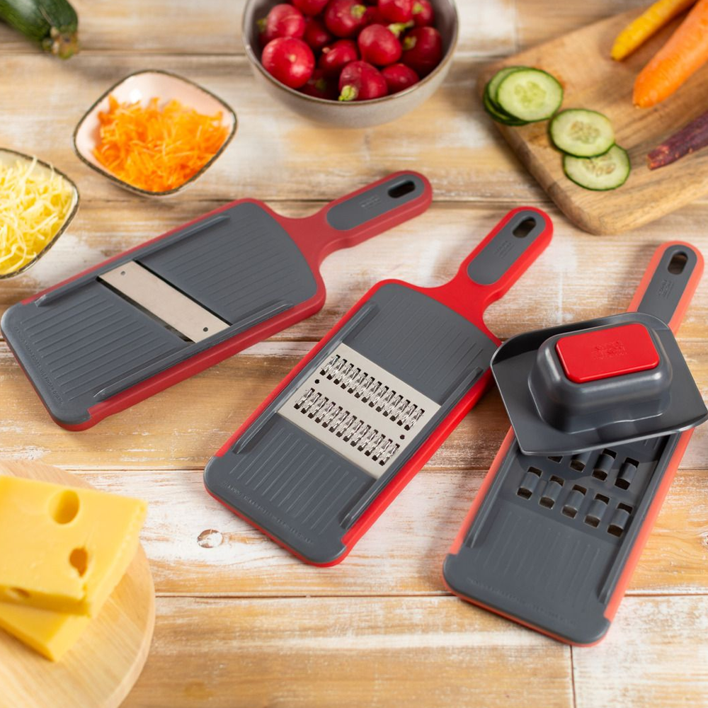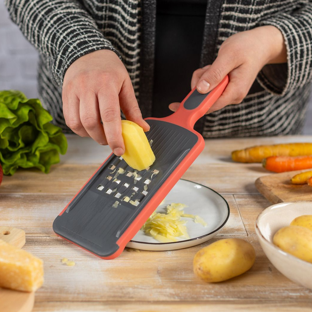 Datorita manerului ergonomic, bazei antiderapanta si protectiei pentru degete, produsul are o siguranta sporita si este usor de folosit. Capetele multifunctionale sunt compacte si se pot depozita una peste alta, putand rade grosisr, fin sau felia. Razatoarea este extrem de usor de curatat, sub un jet de apa sau chiar in masina de spalat vase.