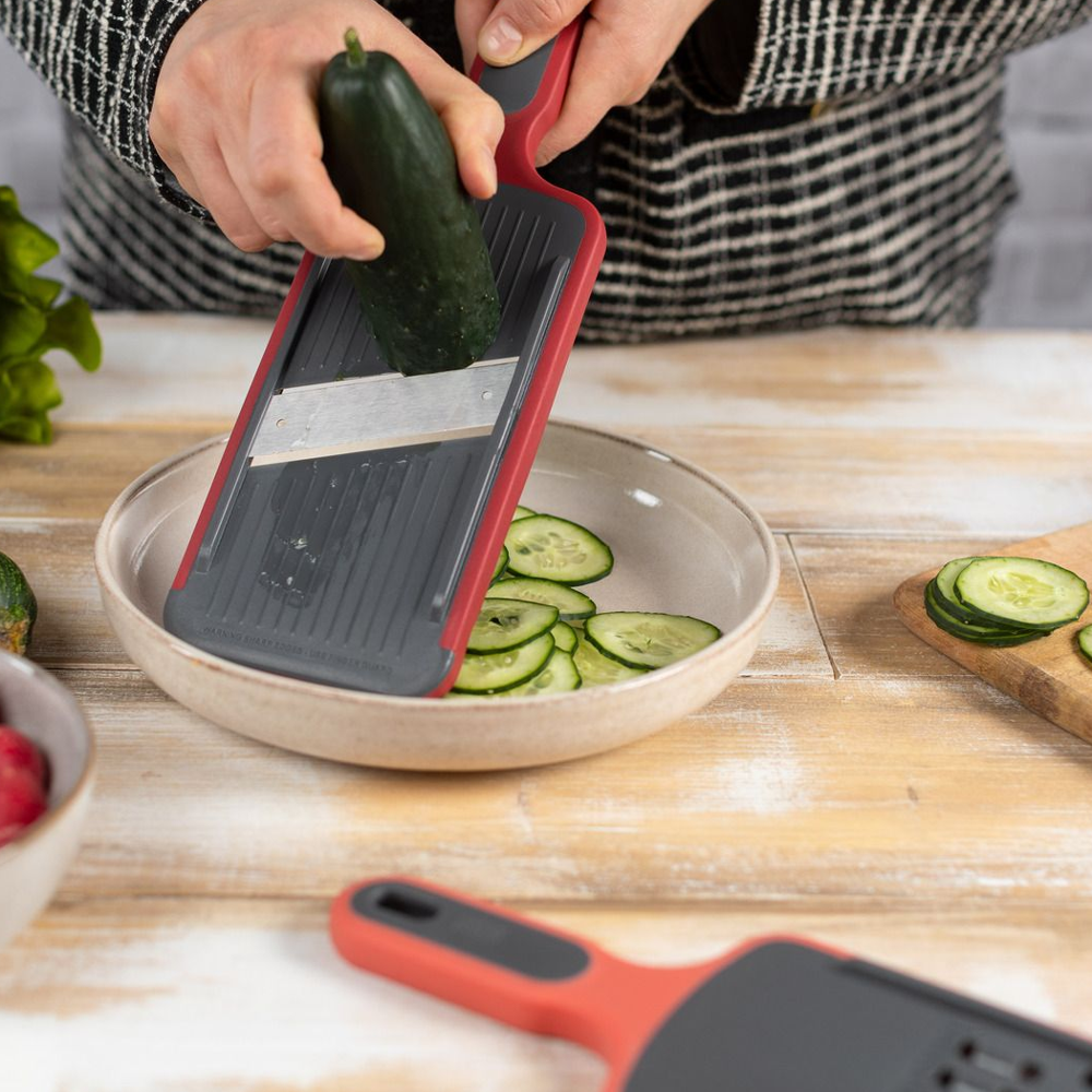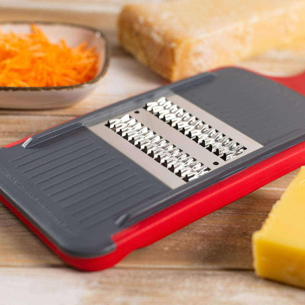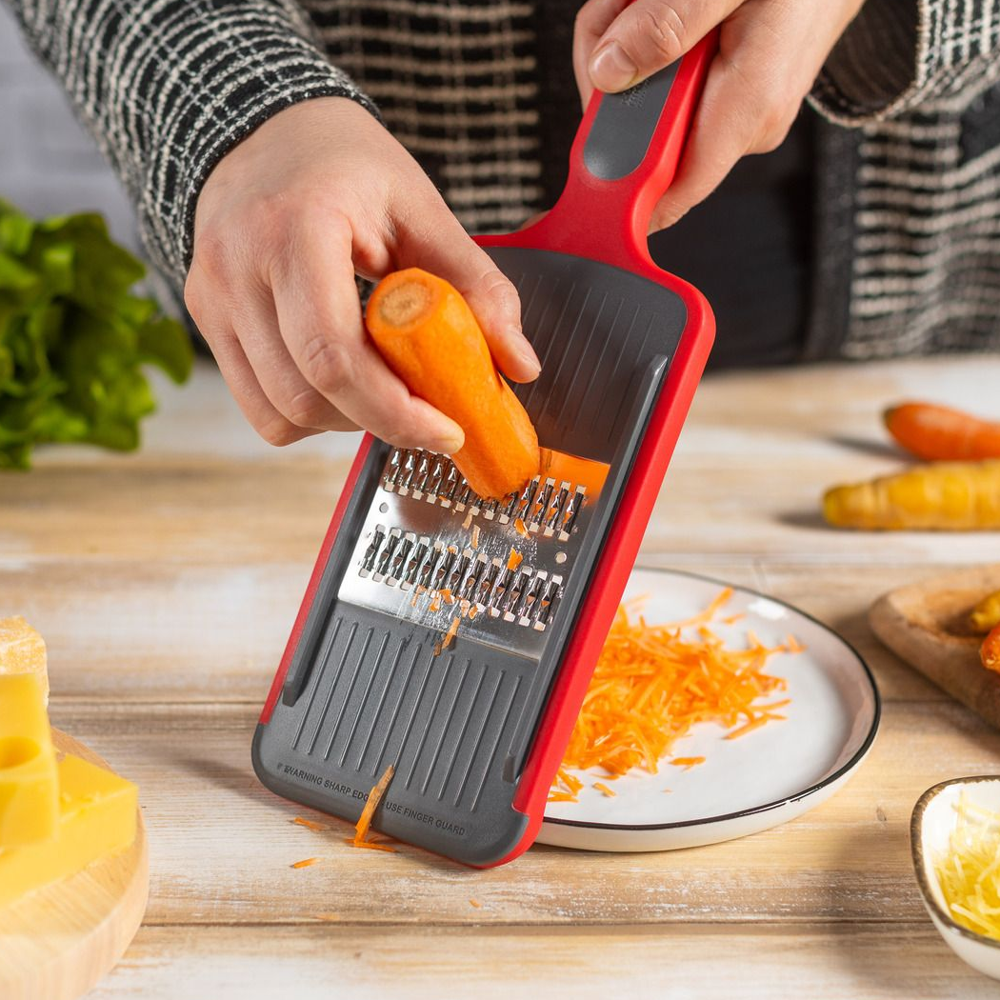 Feliaza si rade morcovi, cartofi, branza si multe altele ca un profesionist! Lamele extra ascutite, din otel inoxidabil, iti vor oferi rezultate perfecte, fie ca iti doresti sa feliezi, razi marunt sau grosier. Feliatorul vine impreuna cu o protectie pentru maini, pentru a-ti proteja degetele in timpul procesului.