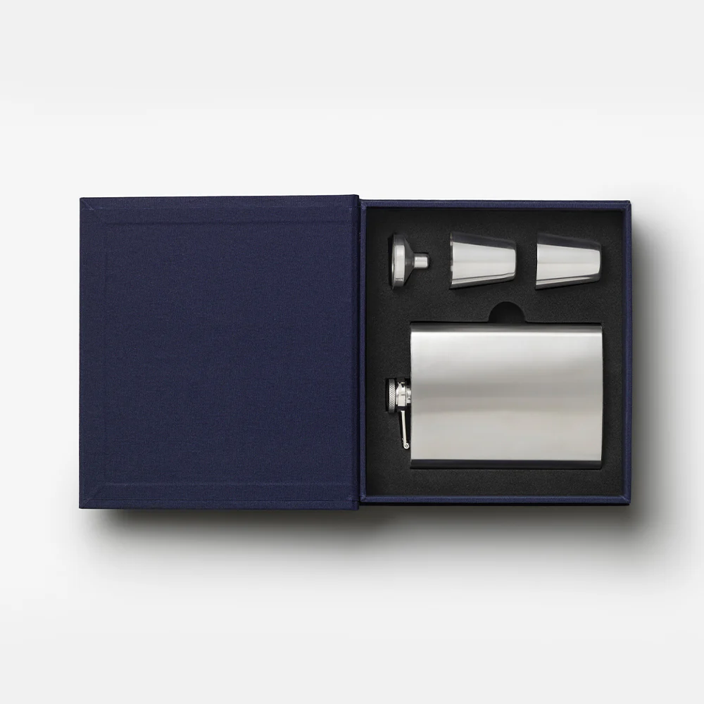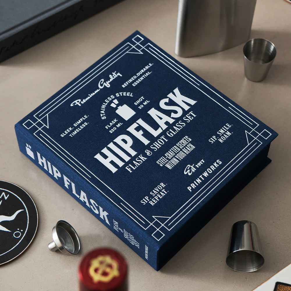 Iti prezentam setul de sticla de buzunar si accesorii, ambalate intr-o cutie rafinata, asemanatoare unei carti de design interior. In interior vei gasi 3 piese esentiale ce iti vor oferi o experienta premium pentru consumul responsabil al alcoolului. Acest produs reprezinta o fuziune dintre functionalitate si estetica, transformand activitatea cosumului de alcool intr-o experienta sociala rafinata si placuta.