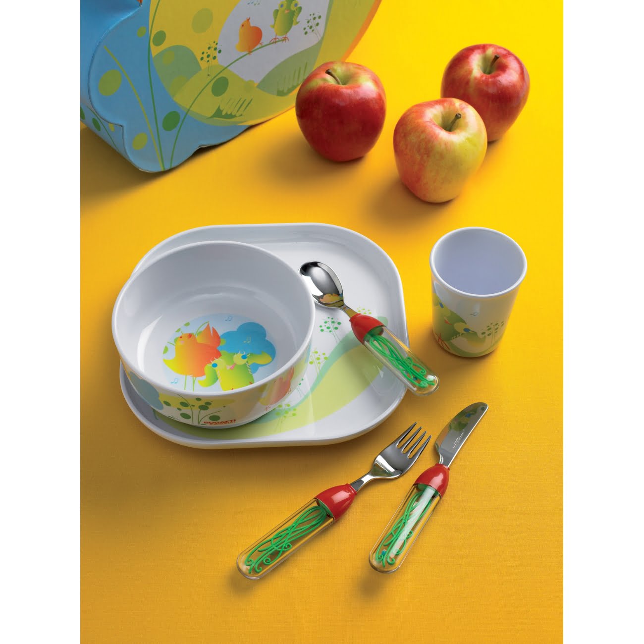 Cu un design vesel si colorat, cei mici vor fi incantati de acest set de tacamuri si masa va fi ca o joaca.
