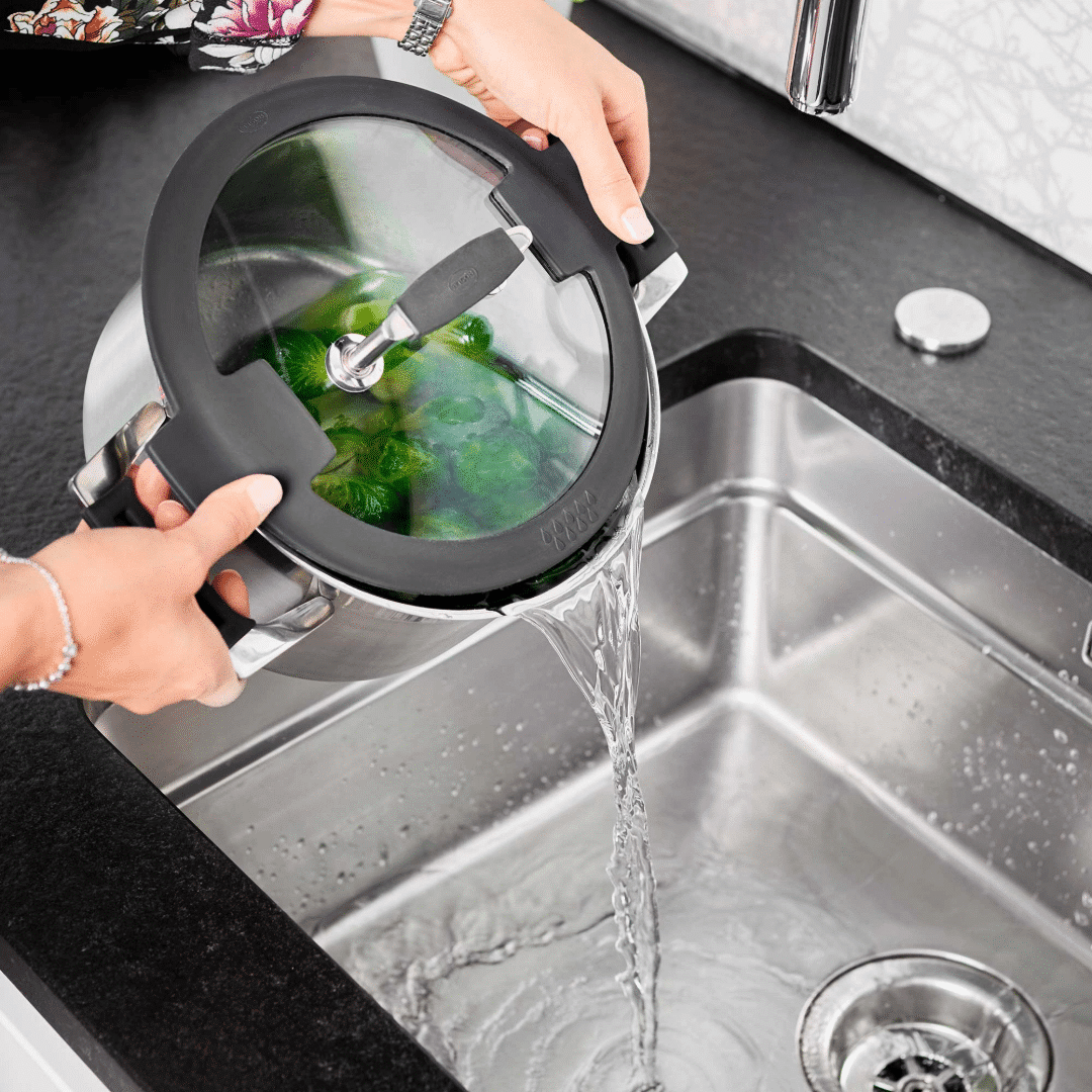 Capac inovator cu functie de scurgere, eliminand nevoia unei strecuratori.