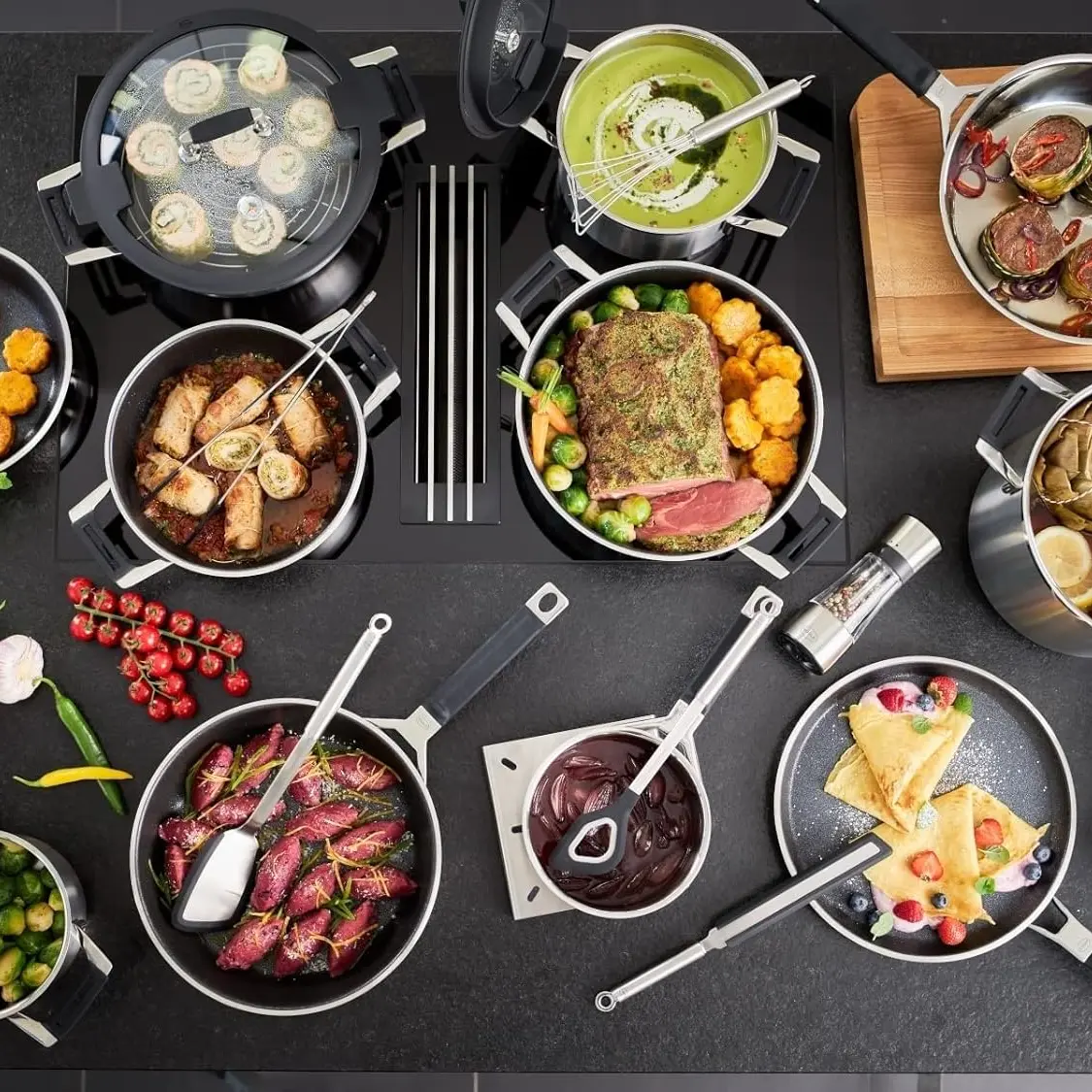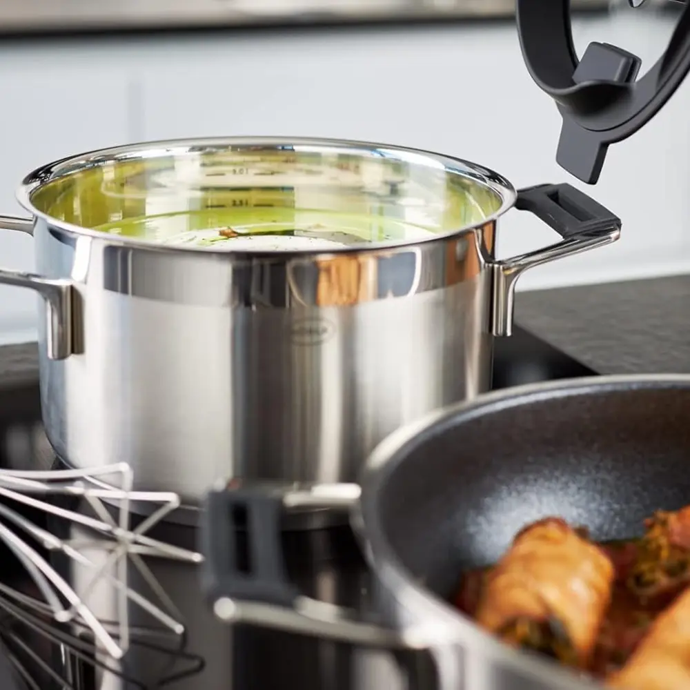 Setul de vase pentru gatit Silence Pro, de la Rösle, este folosit de bucatari profesionisti deoarece este fabricat din materiale de calitate premium, este rezistent la socuri, solid, foarte usor de utilizat si curatat, iar punctul forte este ca poate fi utilizat pe orice sursa de caldura, inclusiv plitele cu inductie.