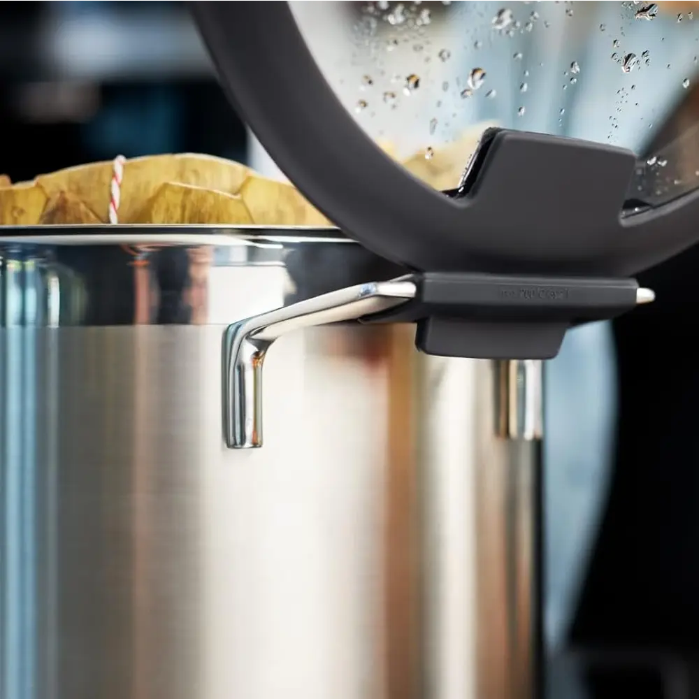 Capacul se fixeaza pe lateralul manerului oalei, iar condensul rezultat se colecteaza direct la marginea acestuia, mentinand plita curata.