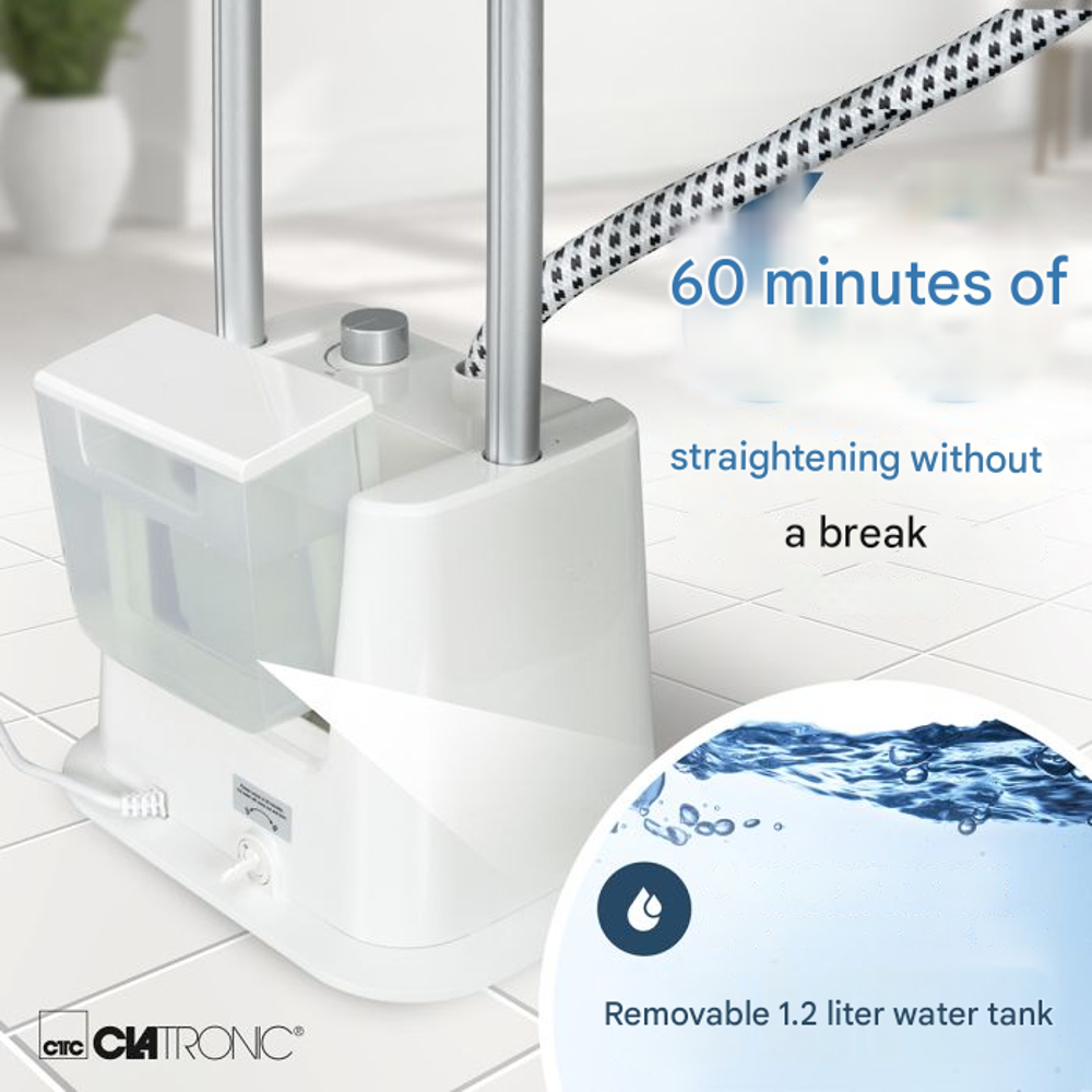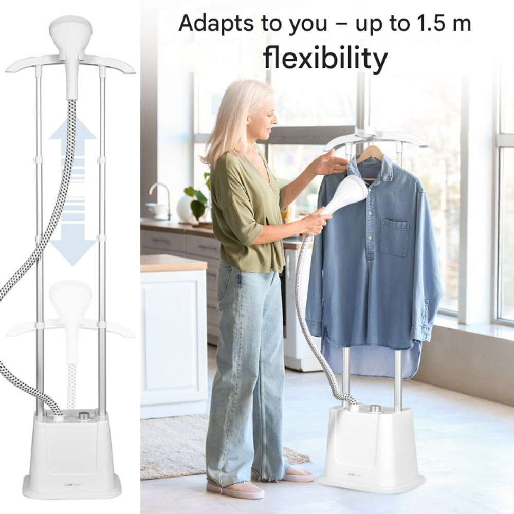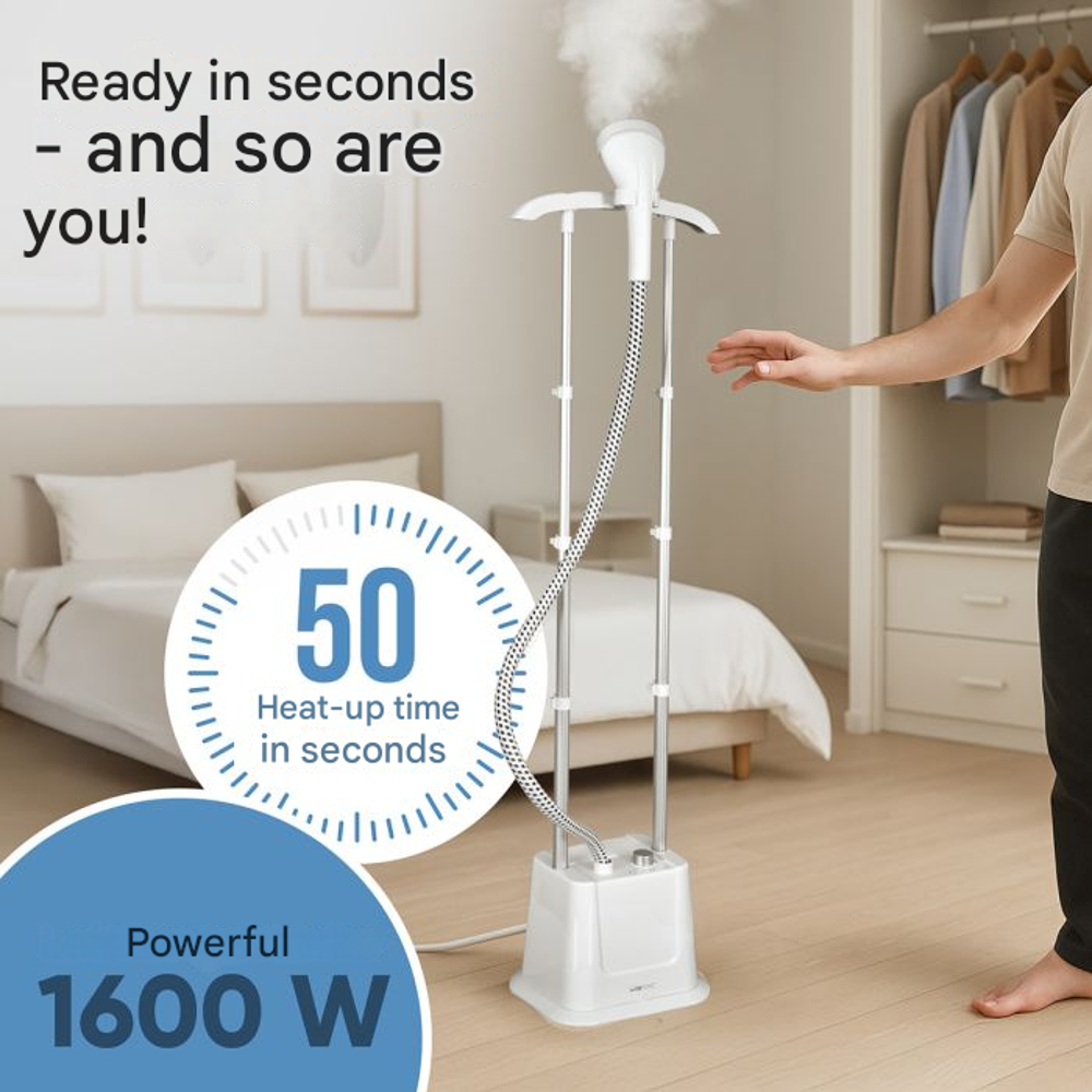 Aparatul de calcat vertical de la Clatronic este dezvoltat cu scopul de a reduce considerabil efortul depus si timpul alocat in procesul de calcare, fiind confortabil, eficient si rapid. Datorita unui design minimalist, se incadreaza perfect in orice spatiu, cu pregatiri minime pentru utilizare.