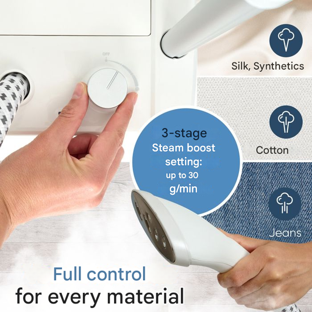 Poate fi utilizat pentru numeroase tipuri de tesatura, fiind ideal in igienizarea si improspatarea materialelor delicate, dar si eliminarea mirosurilor. Aburul elimina bacteriile si ajuta la sterilizarea obiectelor vestimentare si a suprafetelor din material textil.