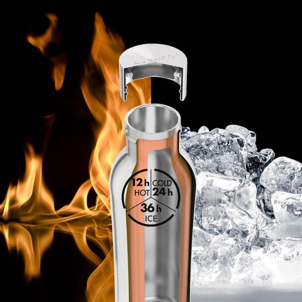 Termosul B Bottles Twin Cromatica este fabricat din 3 straturi de material – 2 straturi din otel inoxidabil si un strat intermediar din cupru, astfel ca sticla termos pastreaza lichidele calde 12 ore, lichidele reci 24 ore si gheata 36 ore.