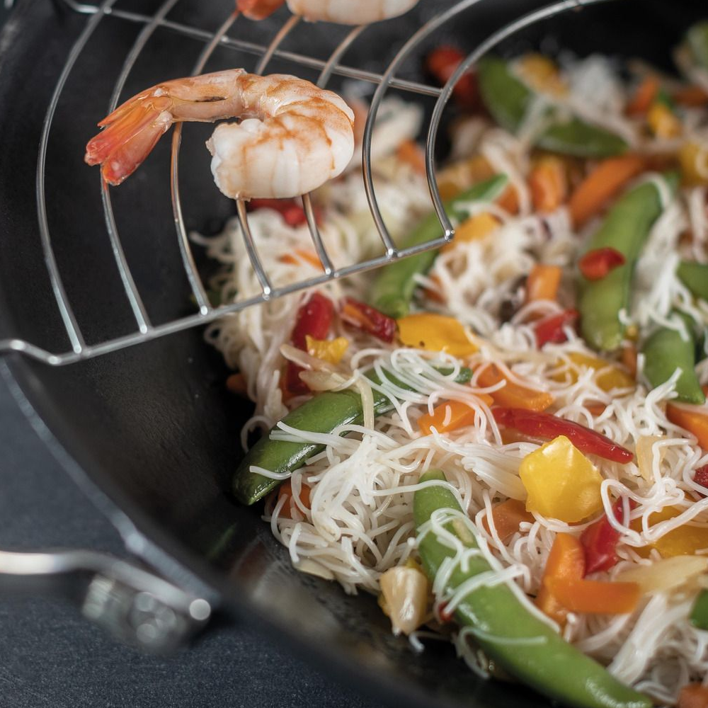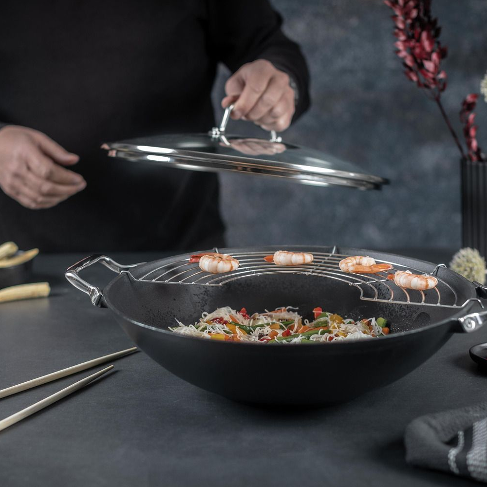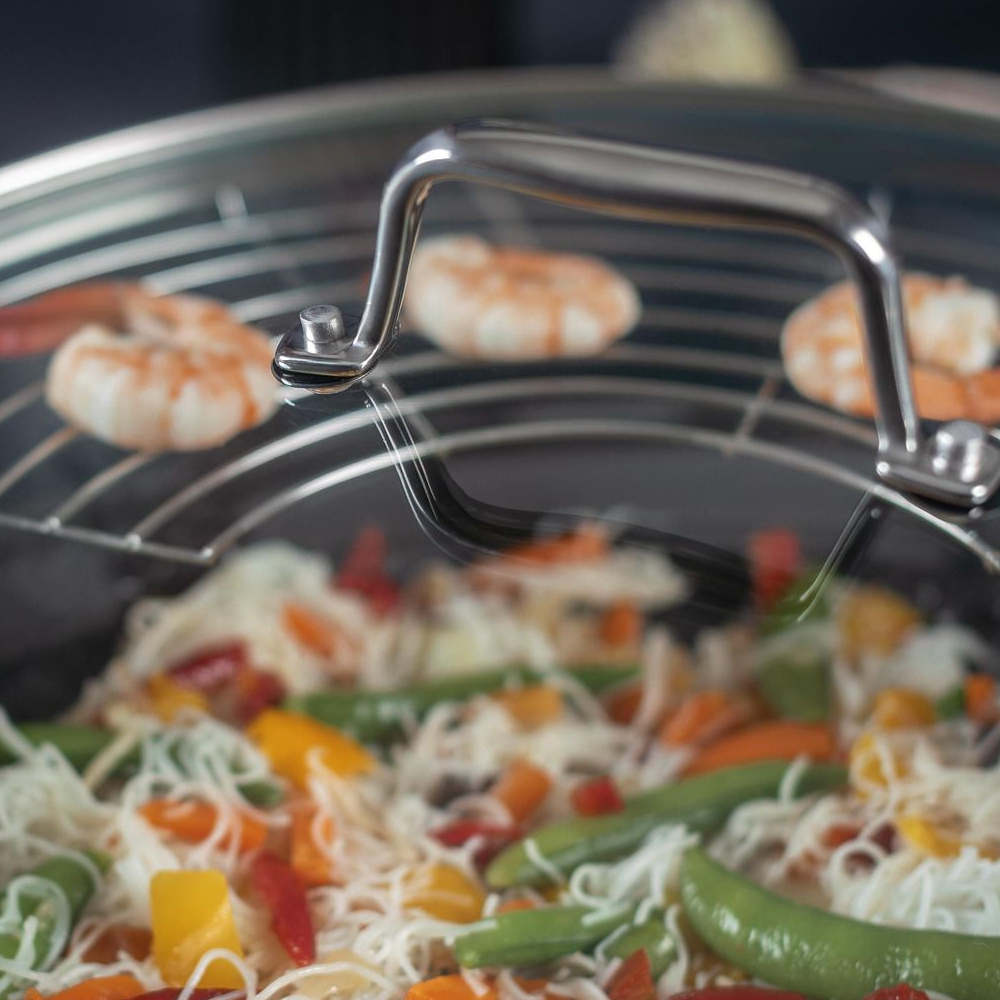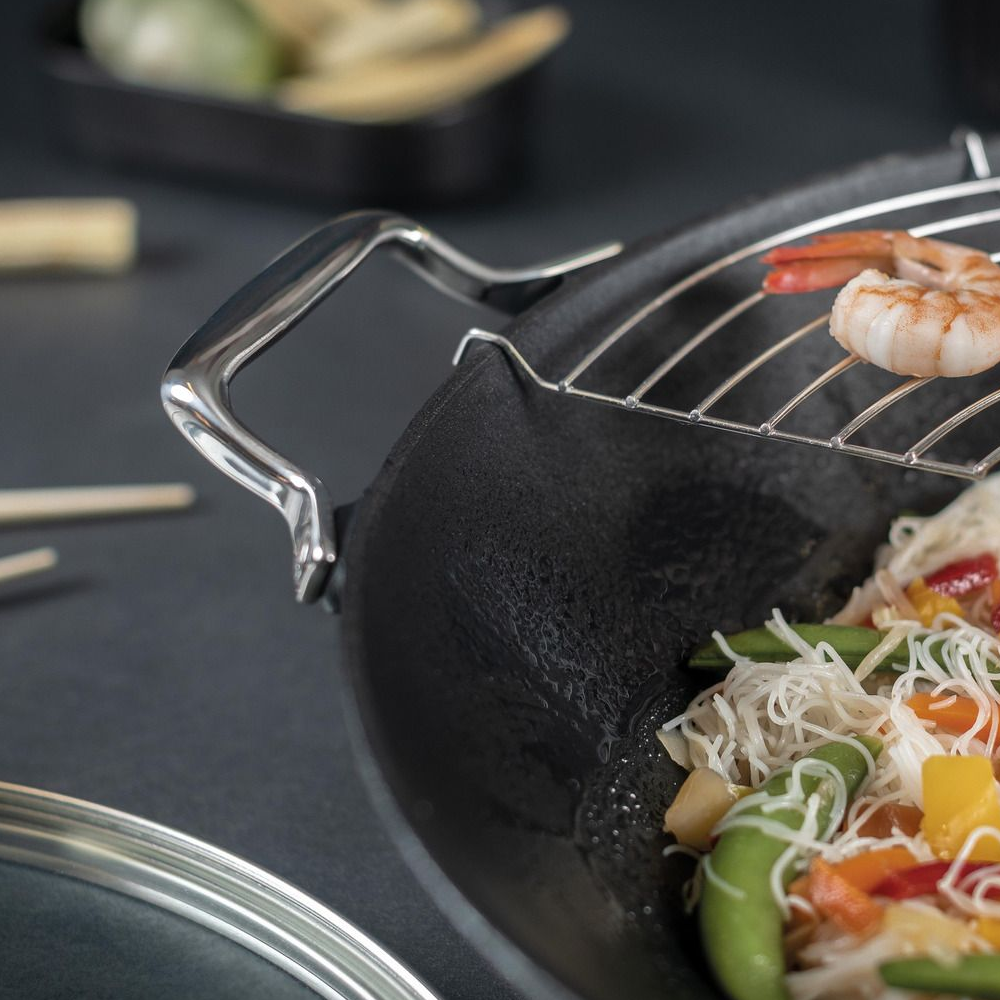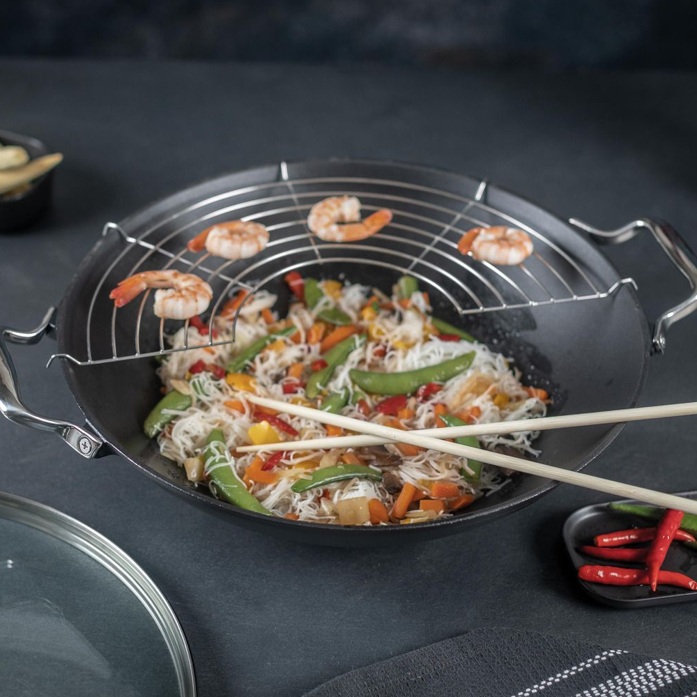 Aceasta tigaie Wok asigura performante de inalta calitate indiferent de felul de mancare gatit, avand o distribuire uniforma a caldurii si o capacitate generoasa. Un punct forte al acestei piese este atasamentul grill semicircular, ideal pentru a gati sanatos si eficient. Alaturi de aceasta tigaie, pentru o bucatarie eleganta si moderna poti utiliza si produse pentru organizarea bucatariei.