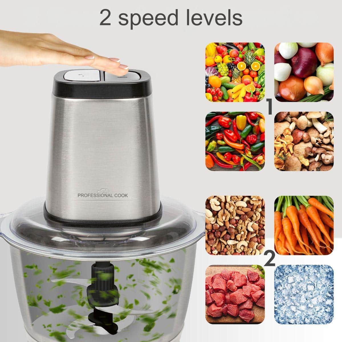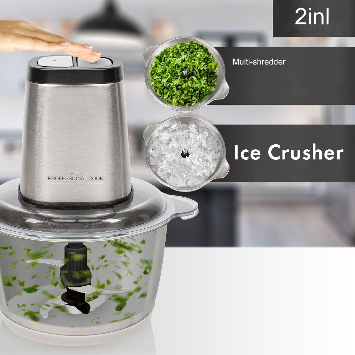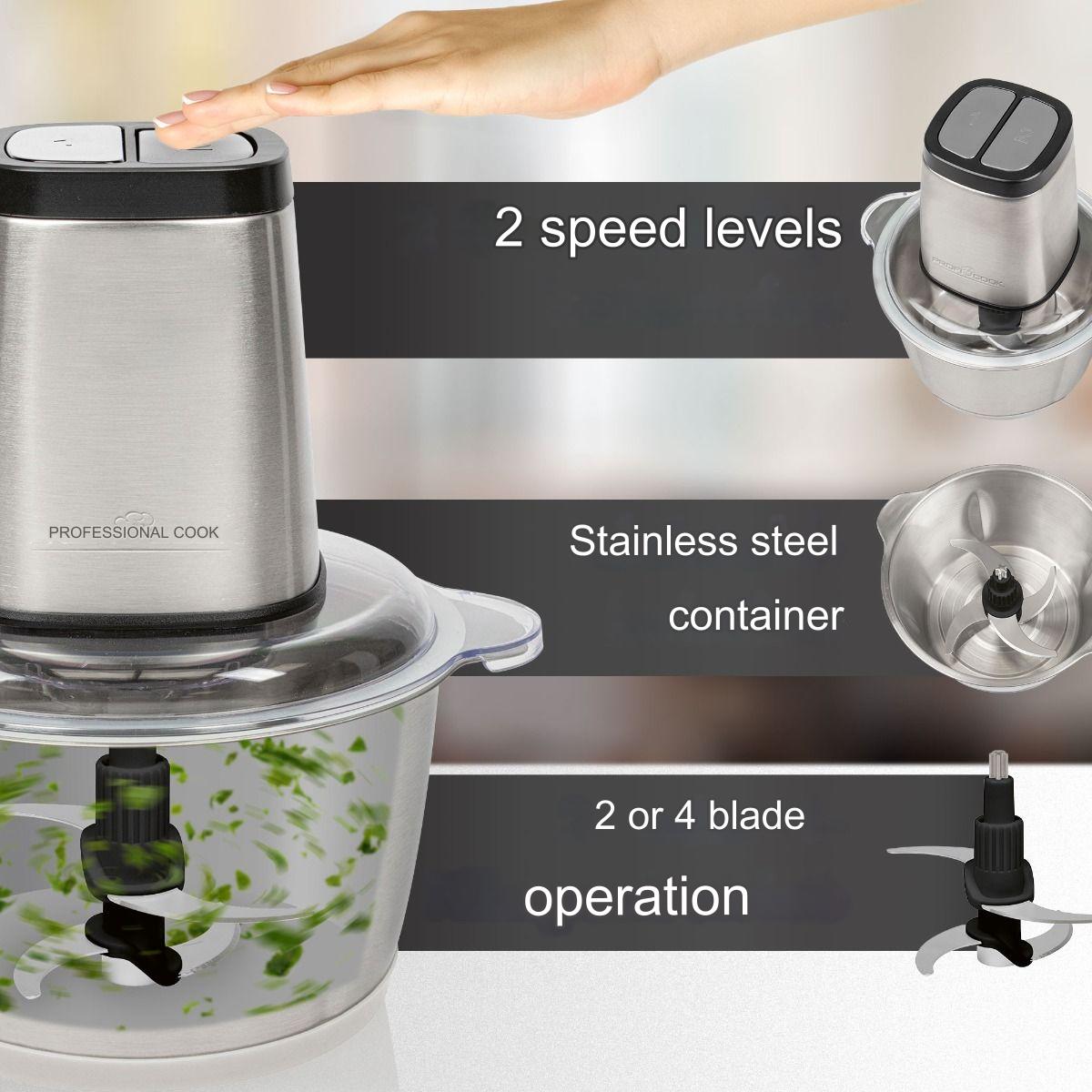 Tocatorul electric de la ProfiCook reprezinta solutia compacta si versatila pentru pregatirea alimentelor, oferind cele mai bune rezultate de taiere datorita lamelor din otel inoxidabil cu 4 cutite dispuse pe doua niveluri si a controlului individual al gradului de maruntire, realizat printr-o apasare pe buton.