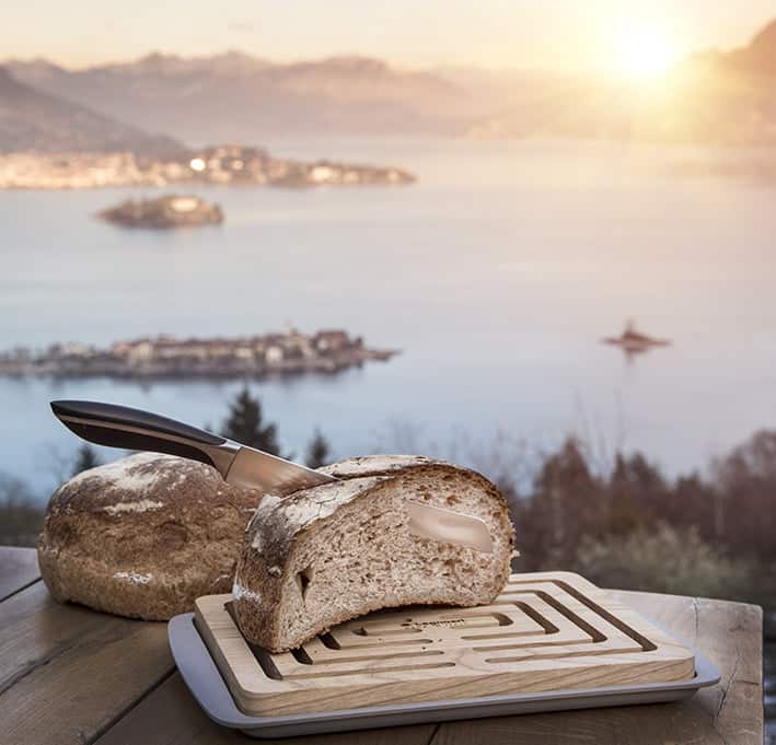 Conceput de designerul italian Enrico Albertini, acest suport pentru felierea painii nu numai ca are un aspect placut, ci are si un design inteligent, fiind dotat cu o tava pentru colectarea firimiturilor.