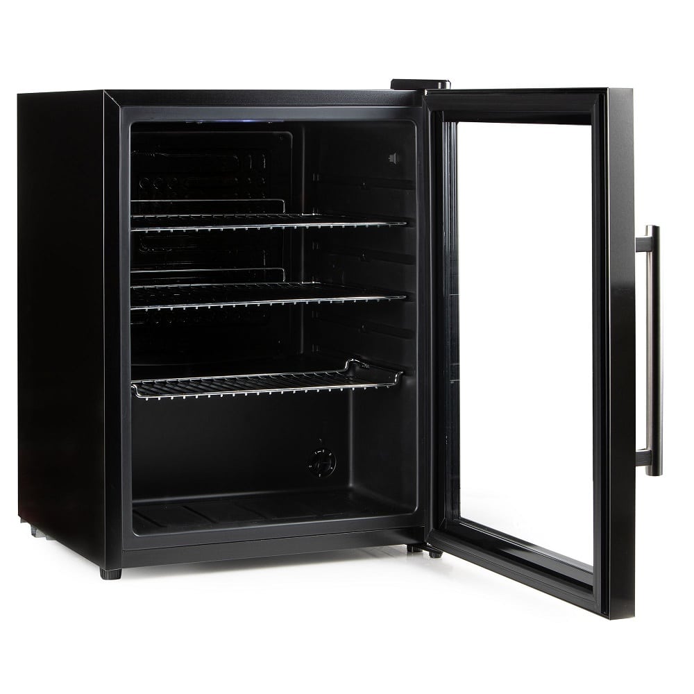 Acest minibar elegant, cu usa din sticla, este extrem de silentios si poate fi folosit pentru a pastra la rece bauturi si gustari.
